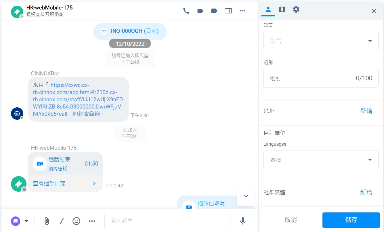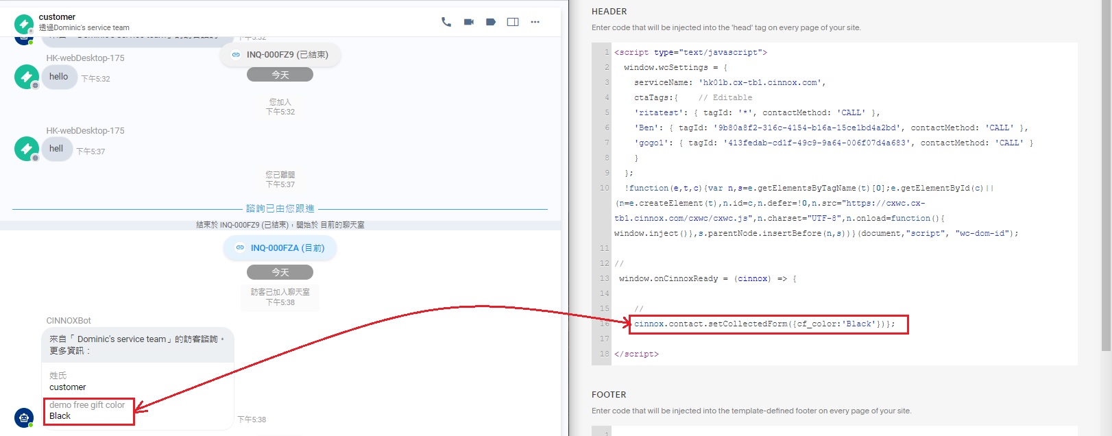 例如,加入了cinnox.contact.setCollectedForm(cf_color:'Black')的代碼後,當訪客開始諮詢,該Function開始使用,聯絡人資料自動傳送到CINNOX。