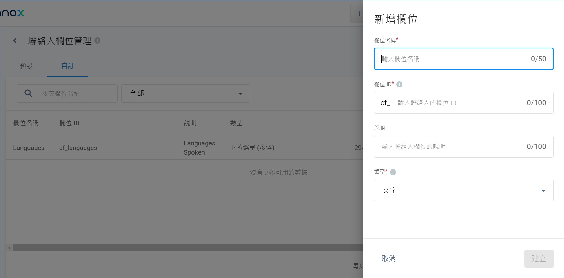 - 欄位 ID的字元上限為100個,不能編輯,只供單一欄位使用。