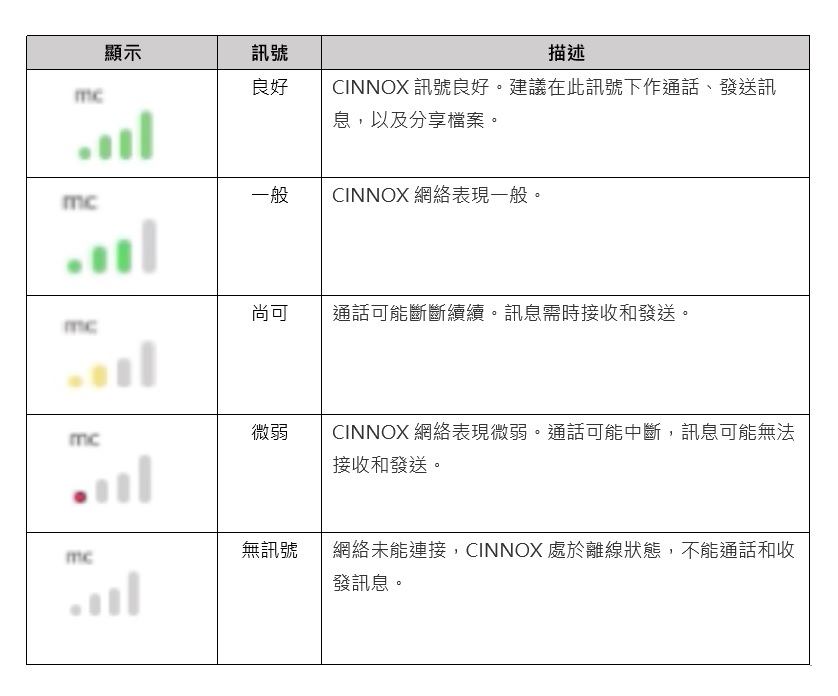 以下表格列出,CINNOX控制面板上不同網絡訊號的情況: