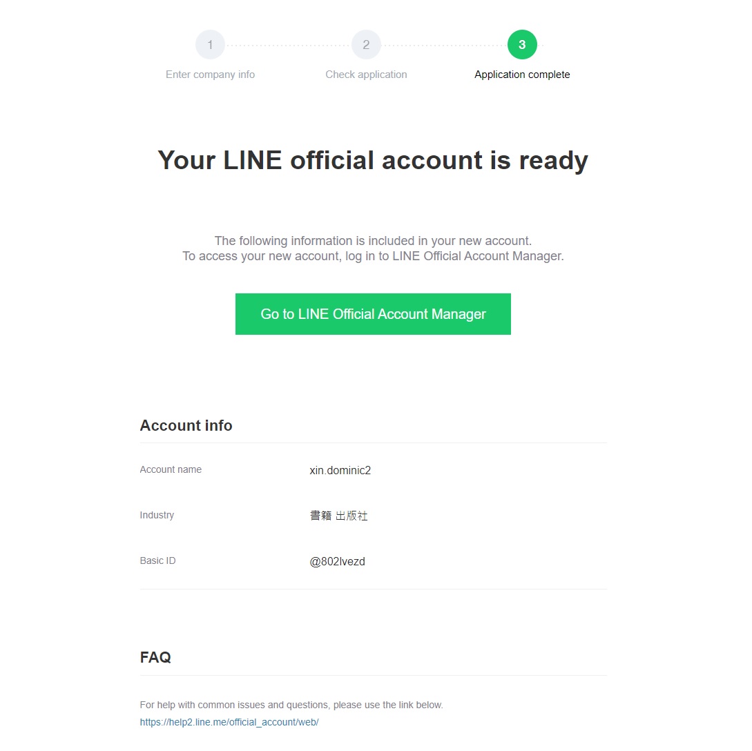 - 當你完成LINE所需步驟後,頁面顯示你的LINE官方帳號已經建立。