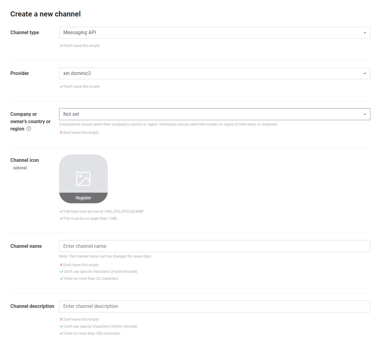 - 填寫你頻道所需的資訊。請注意,頻道名稱中不能包含LINE或類似字元。