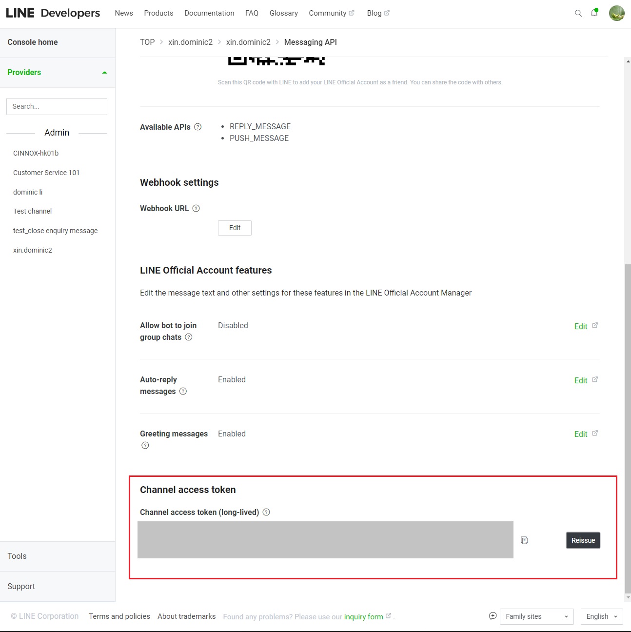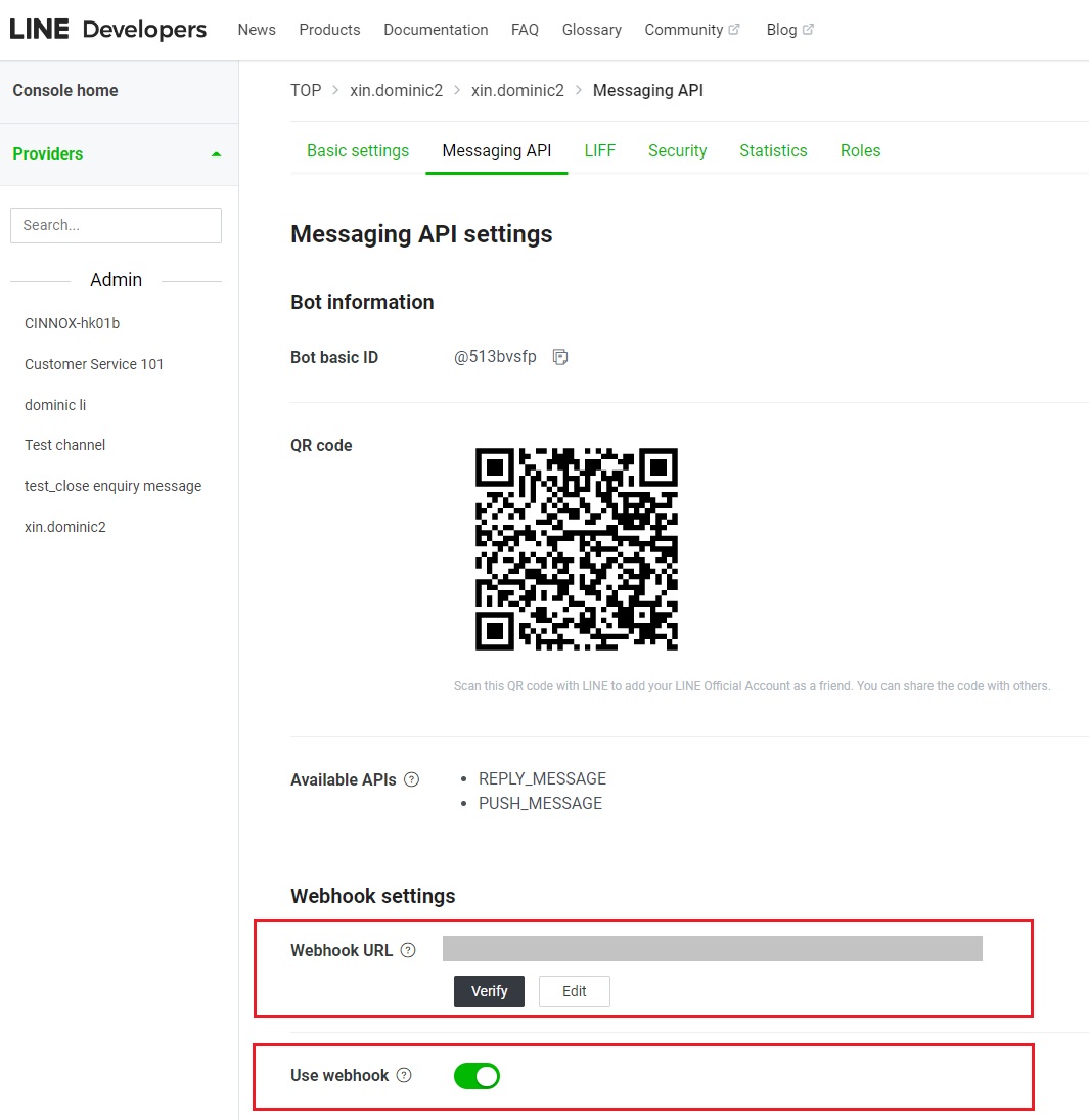 - 登錄你的LINE Developers Account,並檢查其Channel Secret和Channel Access Token,確保它們與CINNOX頻道的詳細資料一致。