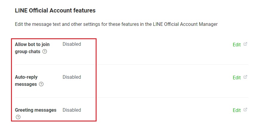 - 在Messaging API 選項中,導航至LINE Official Account features: