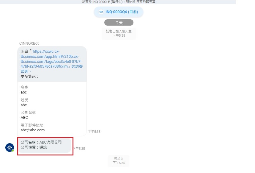- 頻道客製資訊內的資訊,會顯示在員工聊天室的通話諮詢內。