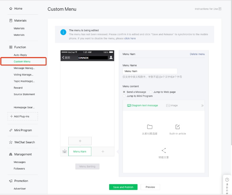 - 任何在微信公眾平台的更改,都影響CINNOX的微信頻道。如果更改任何設定,請按照本章 如何重新激活或編輯自定義菜單。