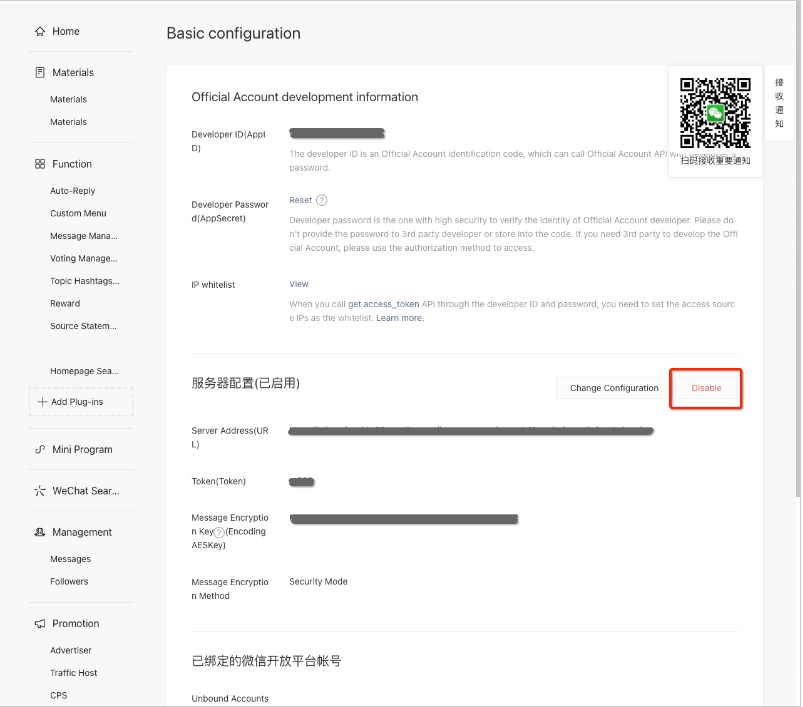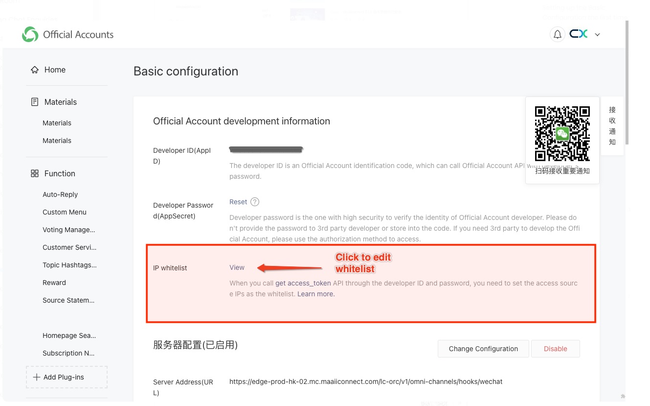 - 如果你的CINNOX沒有收到客戶和訪客的訊息,登入你的微信公眾號,查看其基本配置和帳號詳情,確保與你的CINNOX頻道一致。
