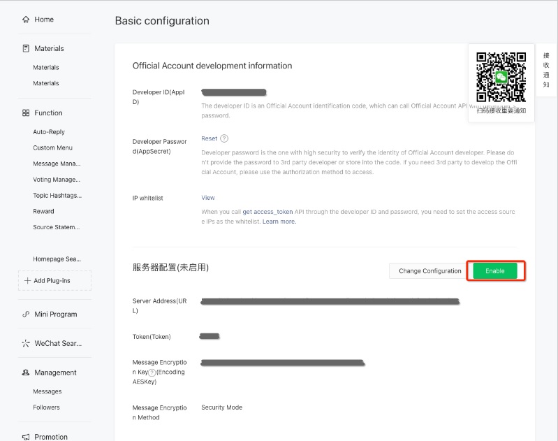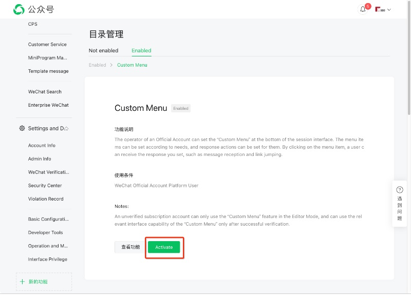 在微信公眾號中,點擊啟用按鈕。