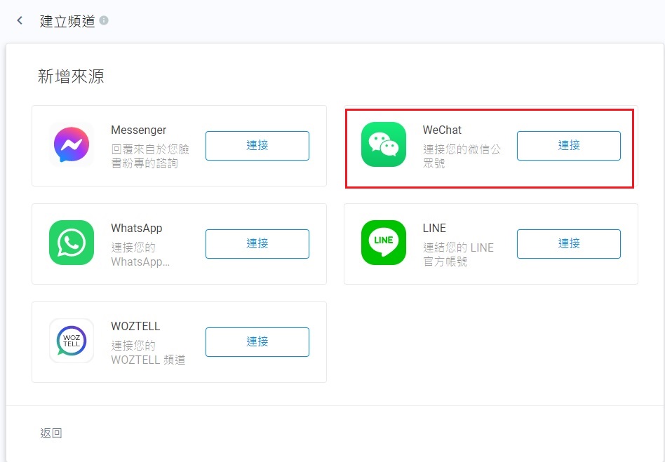 - 點擊**+連接您的微信公眾號**按鈕。