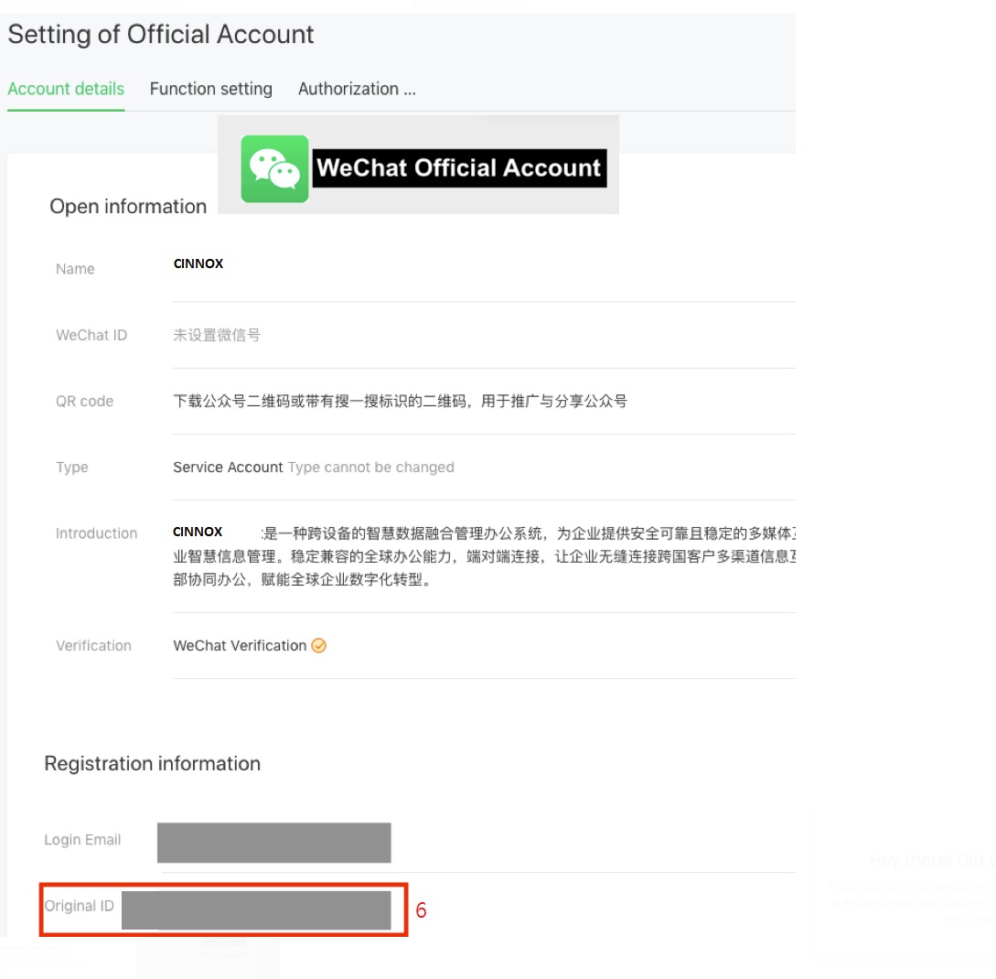 - 原始ID(6) - 進入微信平台>配置>帳號信息>帳號詳情,複製原始ID,並貼到CINNOX相關欄位上。