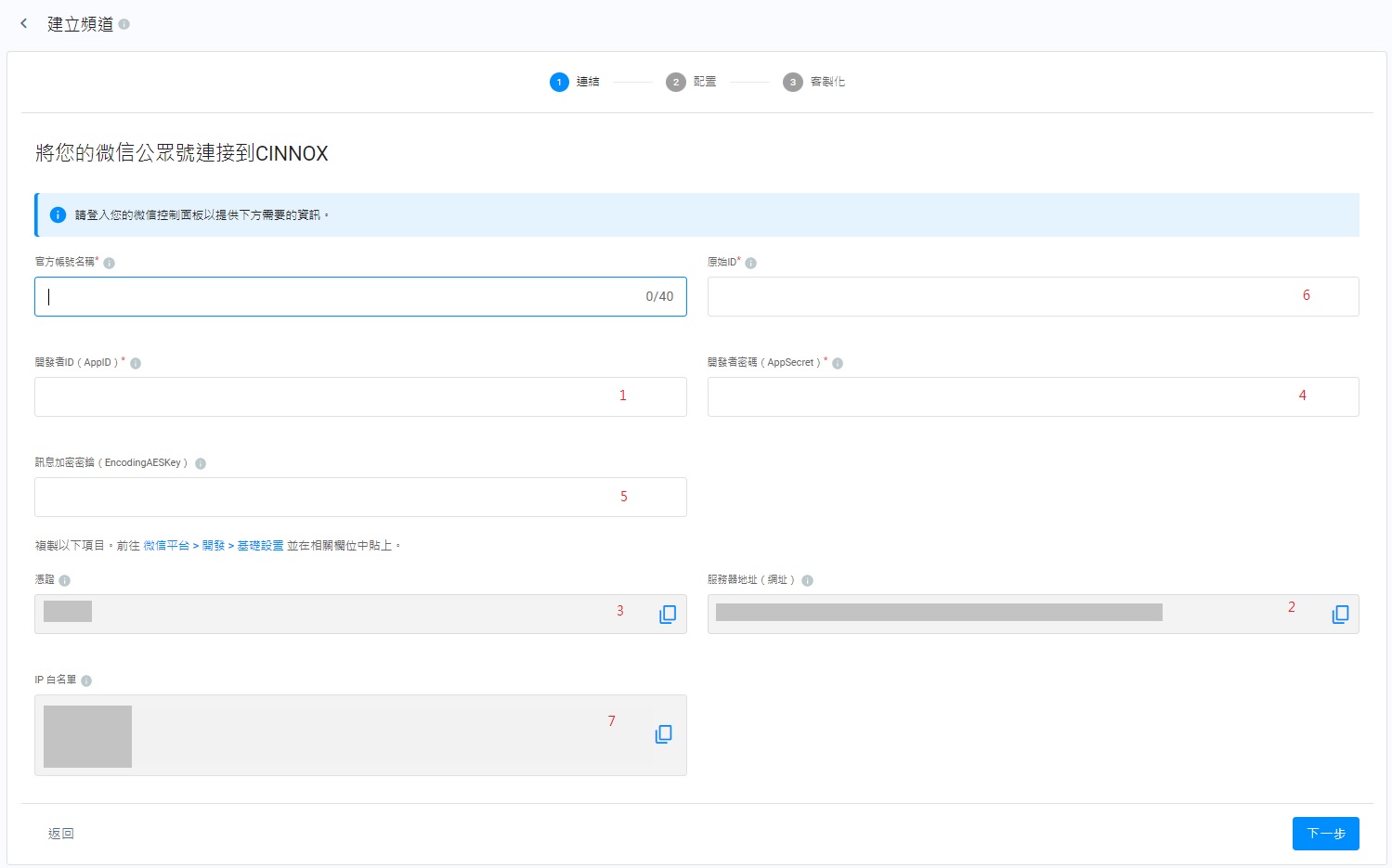 - 在將您的微信公眾號連接到CINNOX頁面上,填寫以下資料: