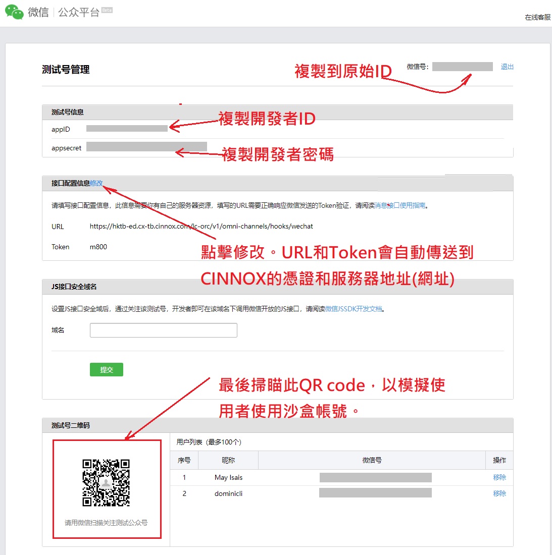 如果你還沒有官方微信帳號,但想測試微信與CINNOX連接後如何,請用CINNOX - 微信沙盒測試一下。