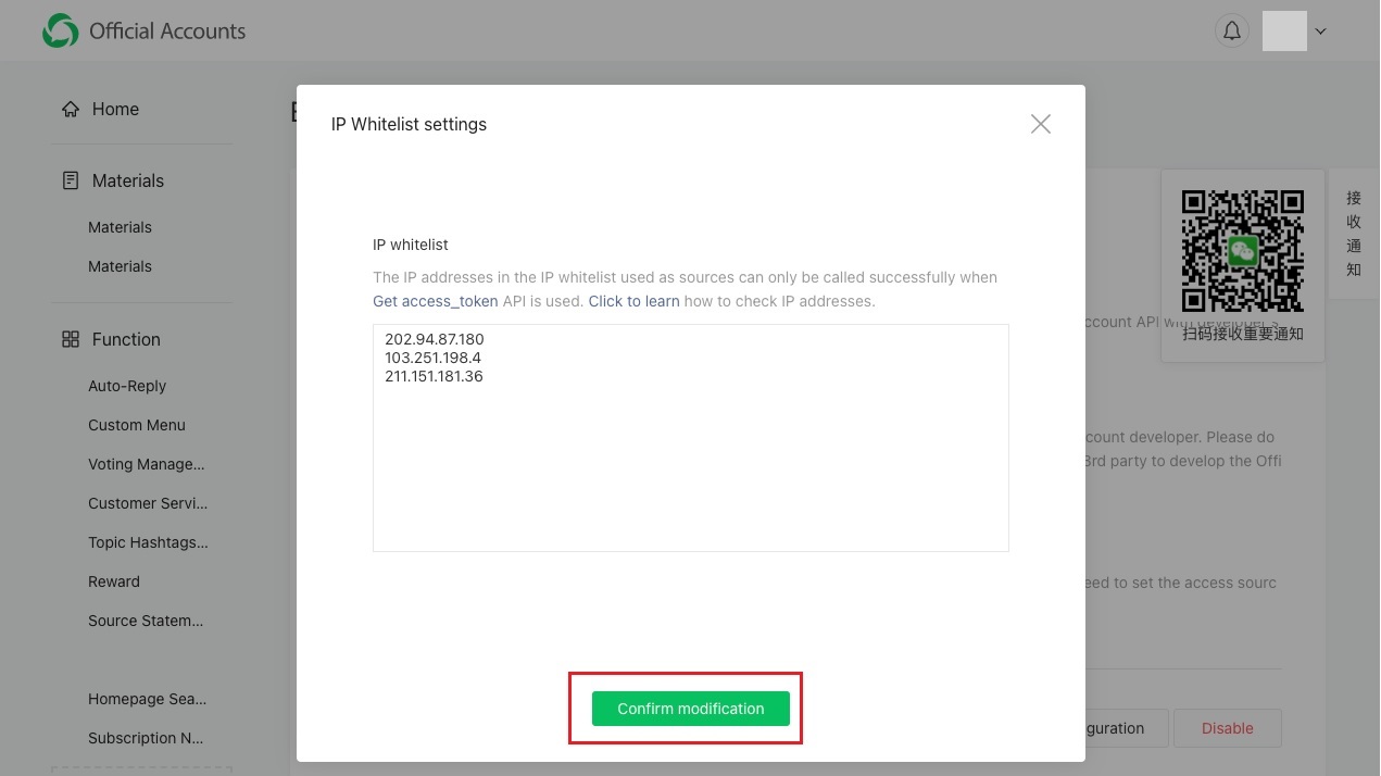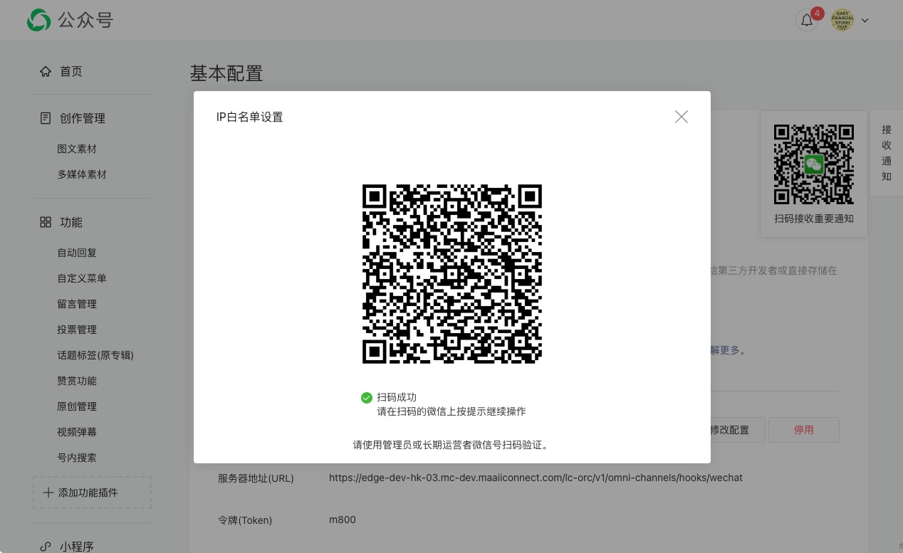 - 如要確認並保存更改,需要使用微信公眾號管理員,或微信的長期使用者帳號,掃描二維碼,驗證操作。