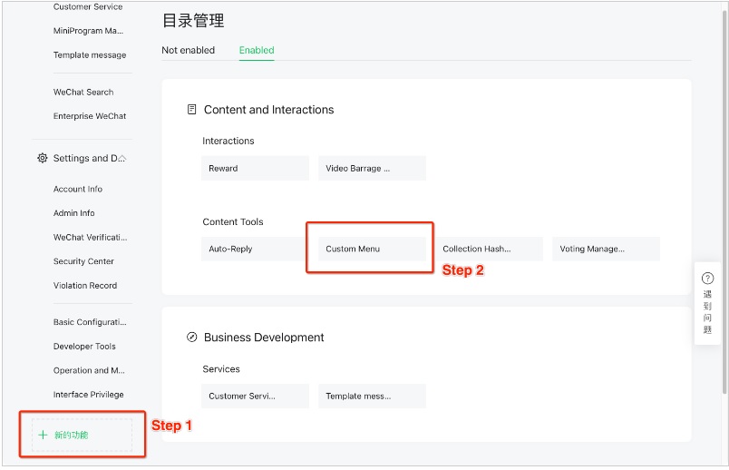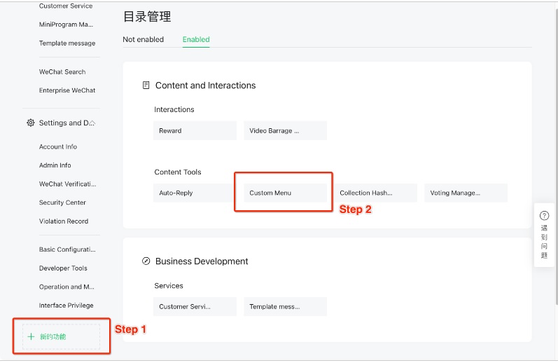 - 微信公眾平台中的自動回覆和自定功能表,不能再使用。如在啟用開發者模式後,再啟動和編輯自定功能表,請參閱如何重新激活或編輯自定義菜單。