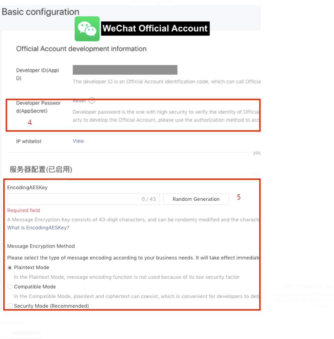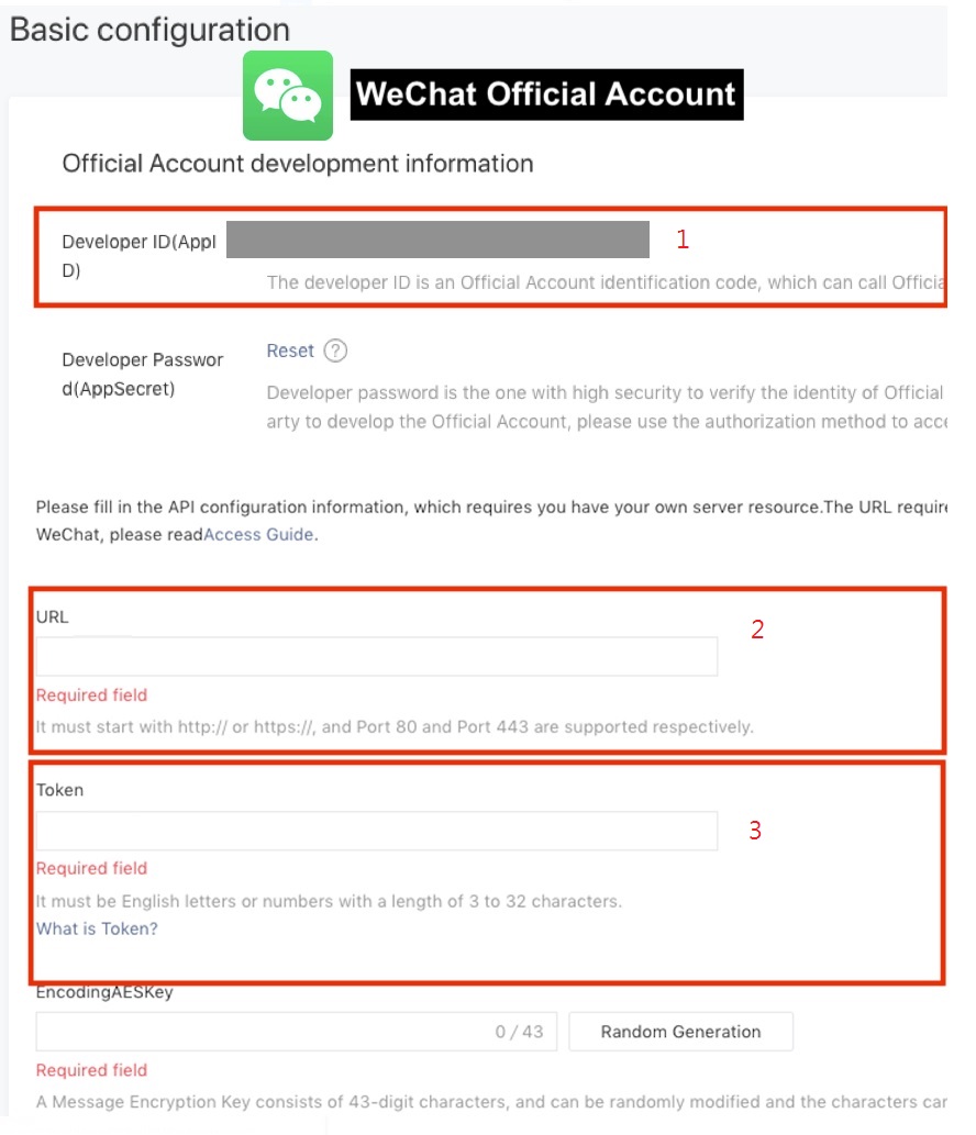 - 訊息加密密鑰(EncodingAESKey)(5):進入微信平台>開發>基礎配置,然後在消息加密方式(加解密方式)下,選擇明文模式。點擊隨機生成(Random Generation),複製代碼,並貼到CINNOX相關欄位上。