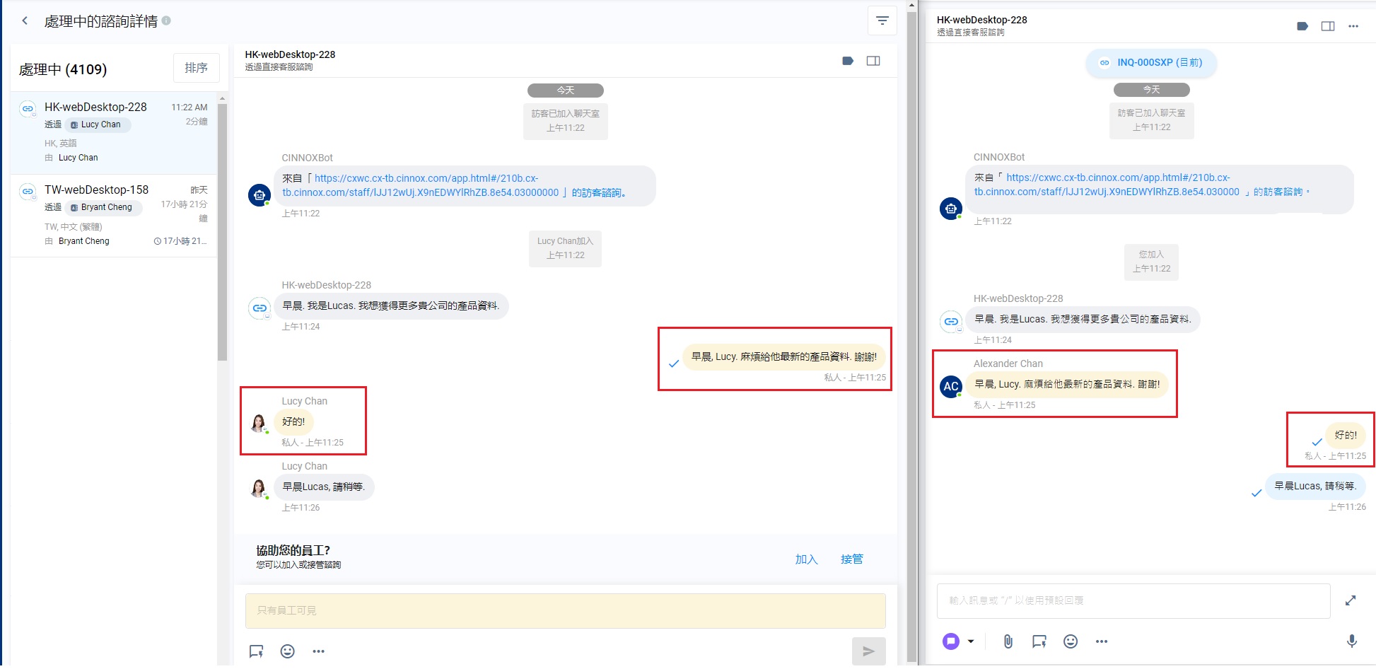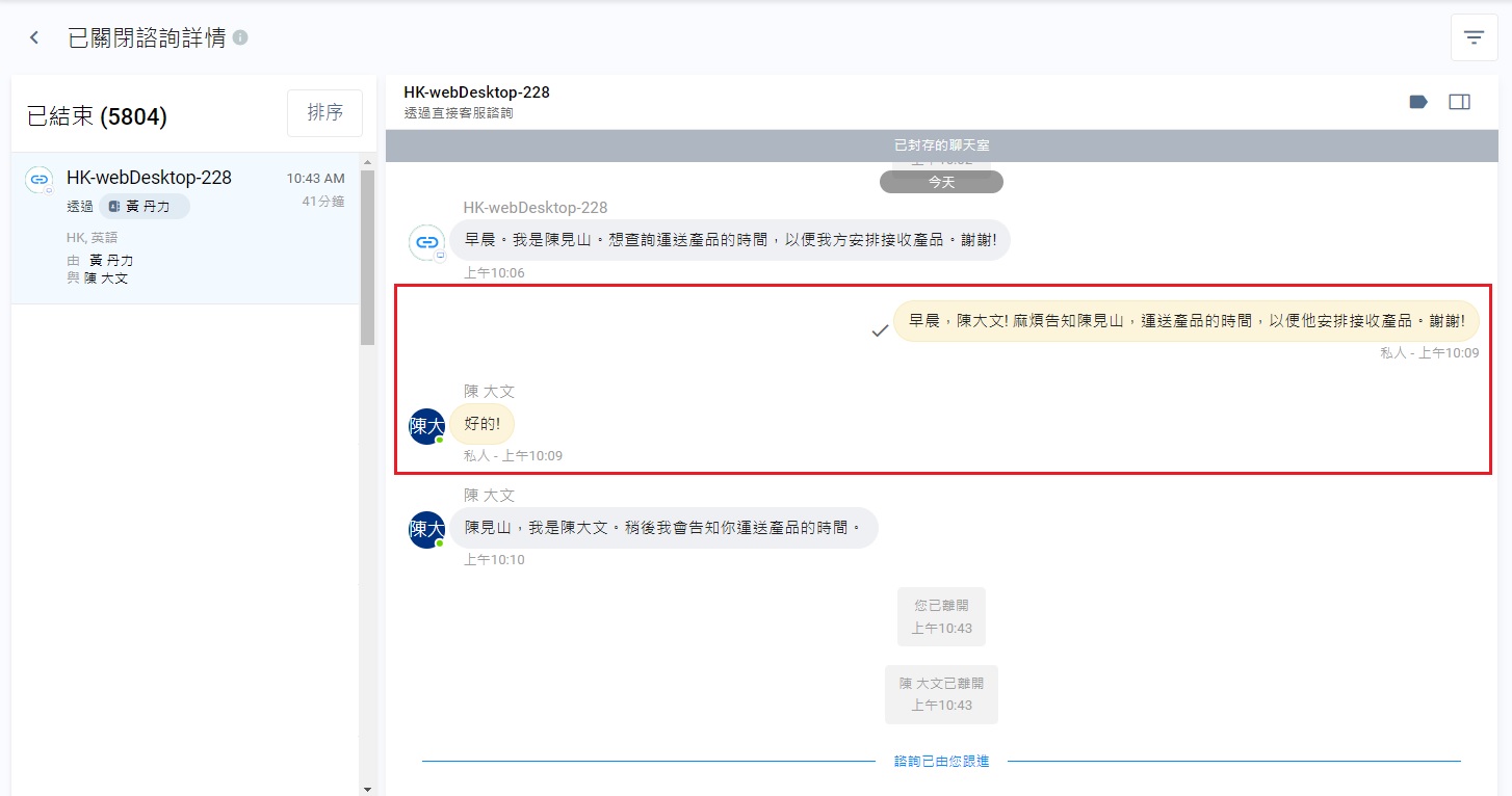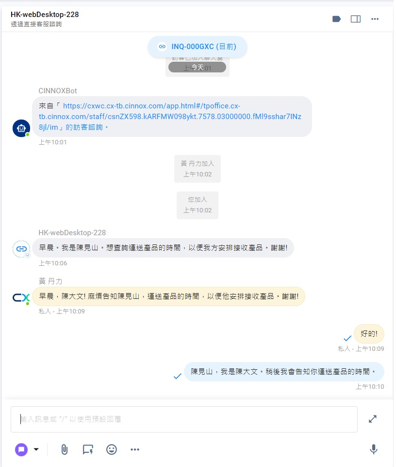 - 加入到聊天室的員工會收到你的訊息,但客戶不會看到。