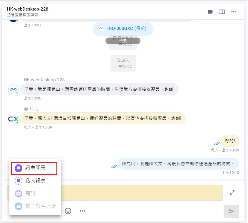 - 當你需要發送訊息予客戶,只需點擊文本輸入欄左側的切換頻道圖標,然後選擇訊息聊天便行。