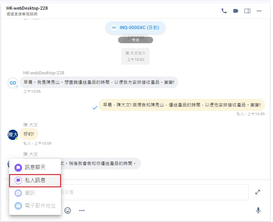 - 當你在諮詢聊天室聊天時,加入了其他員工。這時,私人訊息發揮最大功用。