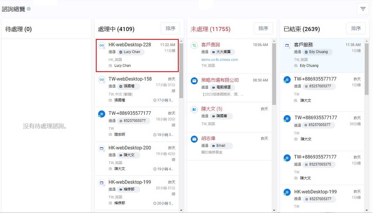 - 導航到諮詢總覽,然後,在處理中欄目中點擊正由客服處理的諮詢。