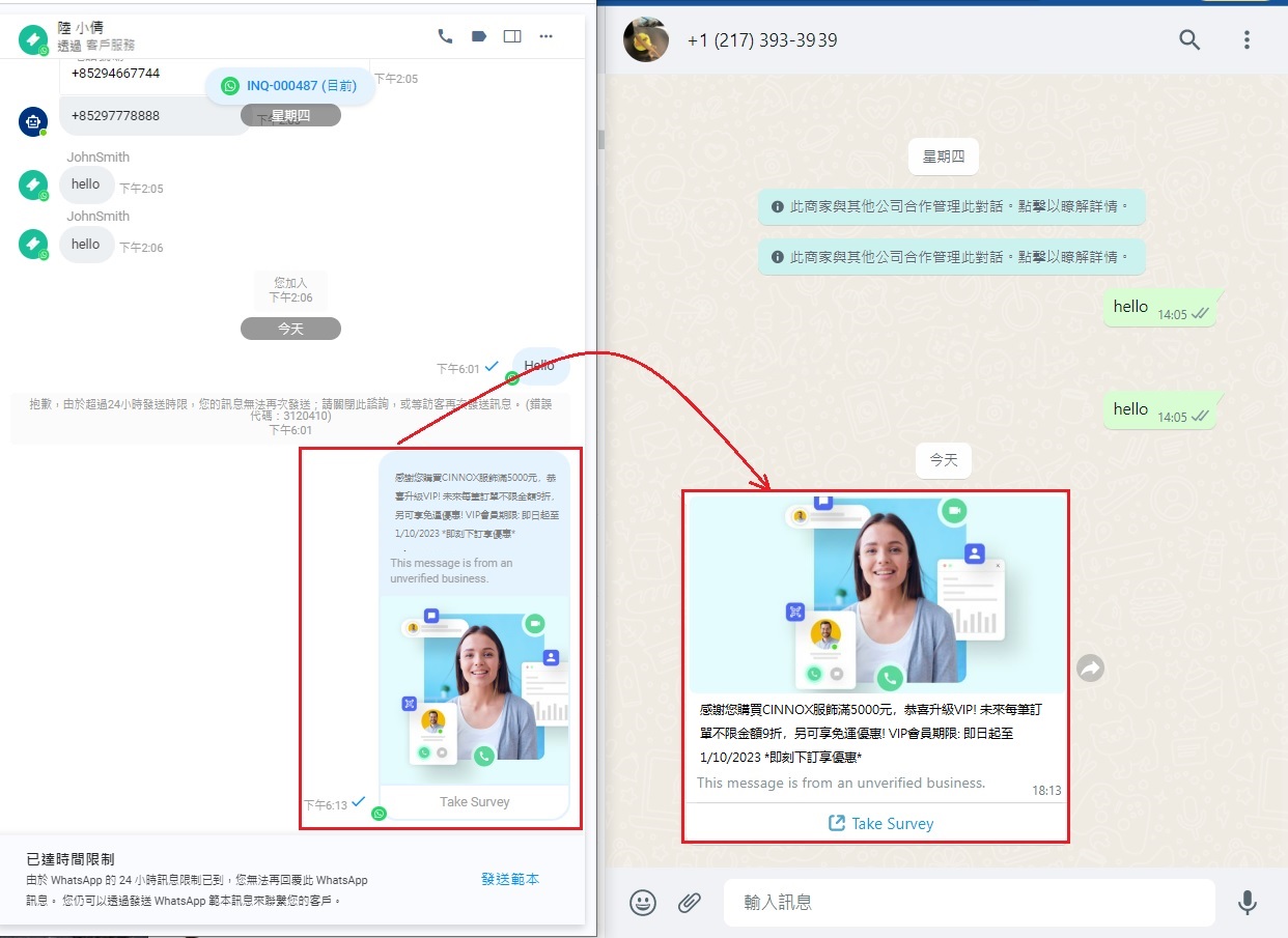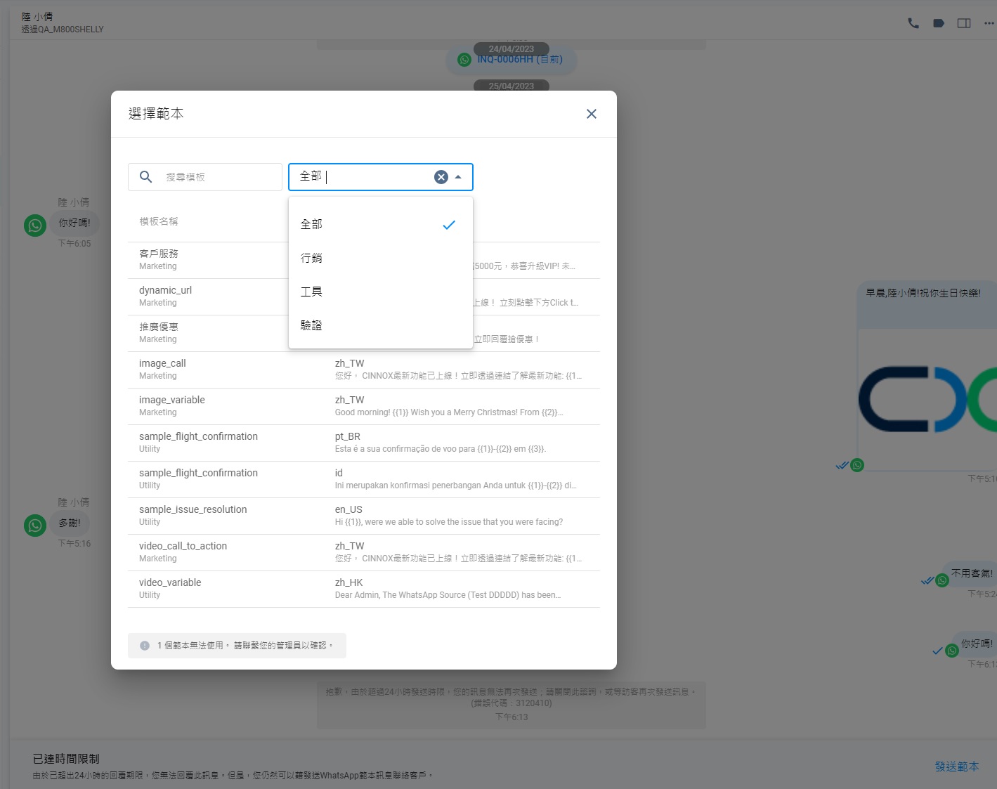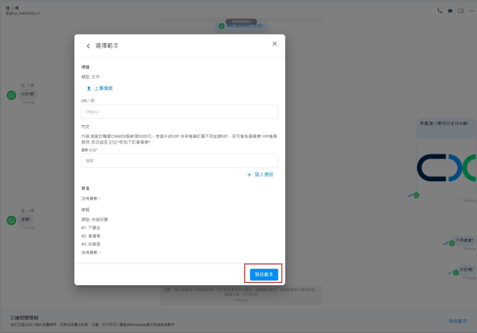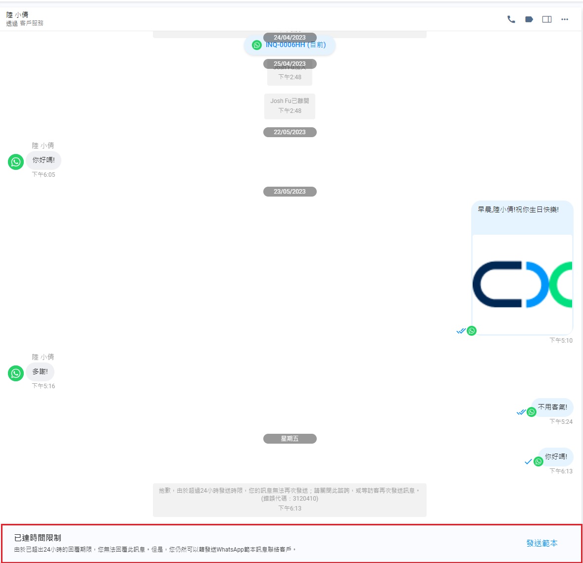使用以360dialog作為來源的WhatsApp,可以在WhatsApp 諮詢限時已過時,發出範本訊息,重啟諮詢對話。如要使用這項功能,管理員必須啟用重啟對話範本訊息,並需預先選擇範本。有關啟用重啟對話範本訊息的資料,請參考**重啟對話範本訊息**。