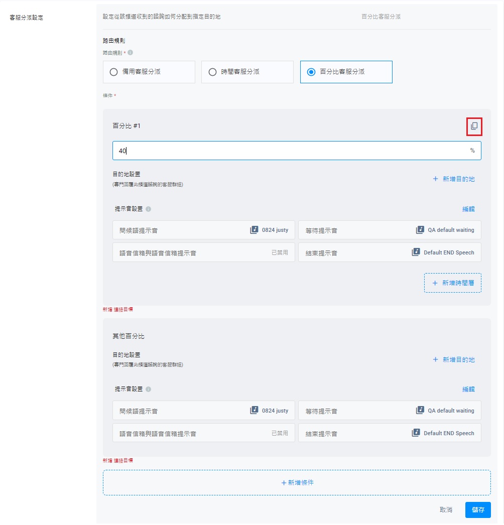 - 複製的設定會繼承原有設定,包括:目的地(Destination)和提示音(Prompt)。