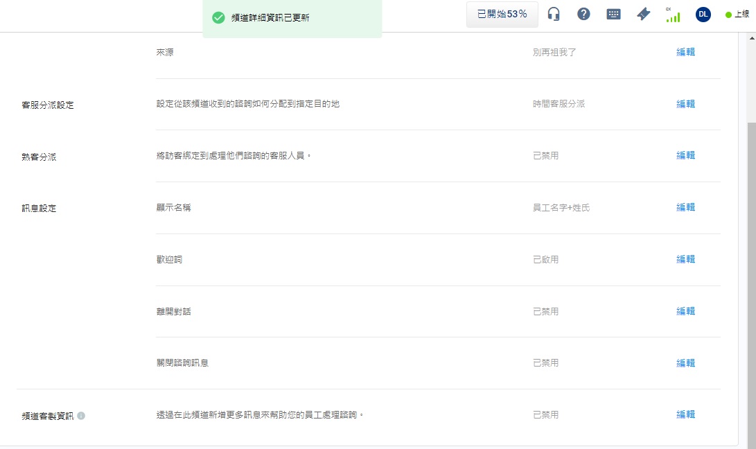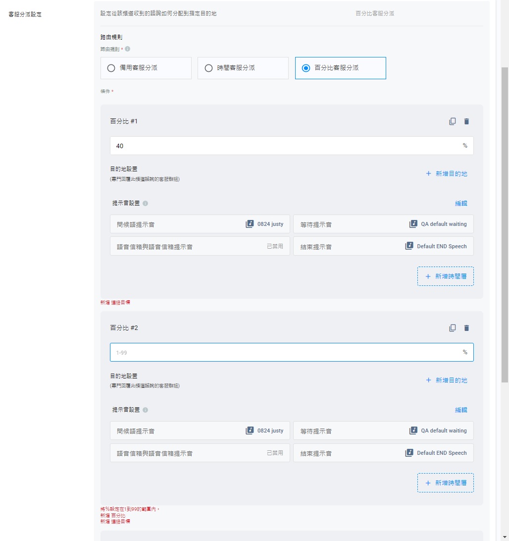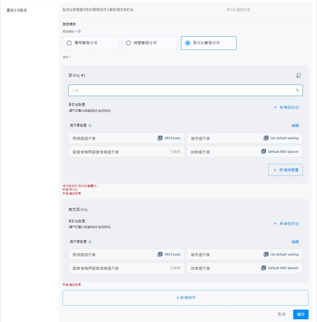 你可以自行在時間客服分派上新增百份比層,從而根據百份比分配諮詢。