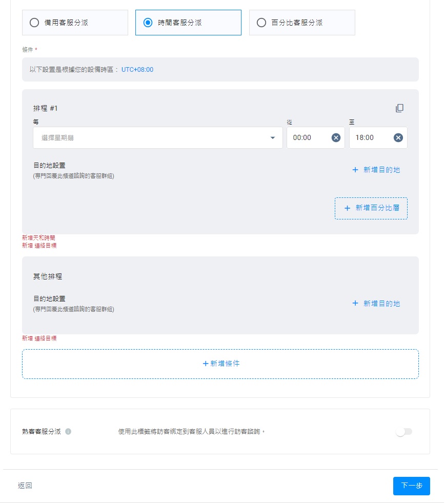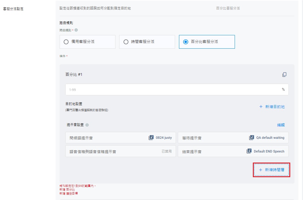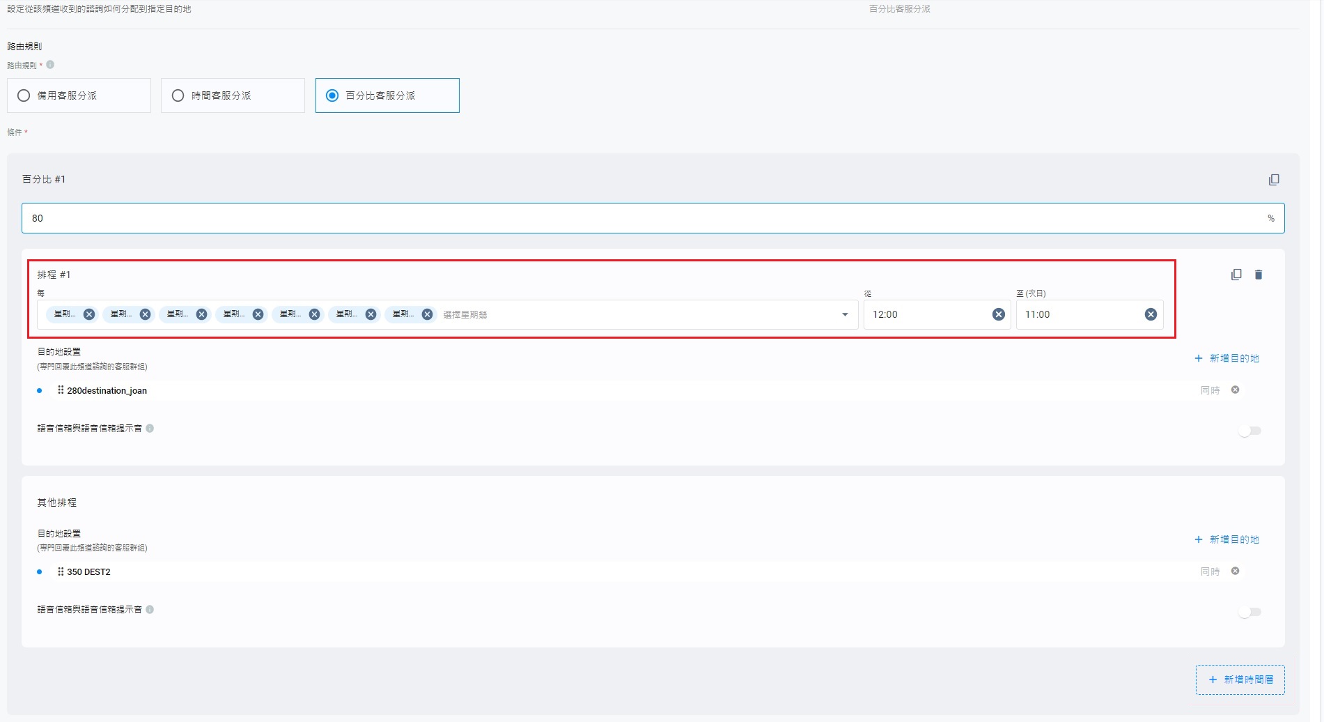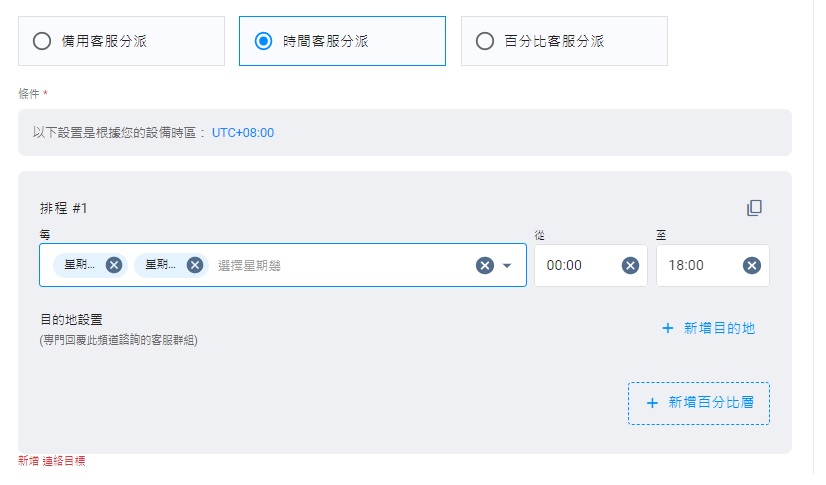 你可以自行在百分比客服分派上新增時間層,從而根據時間分配諮詢。