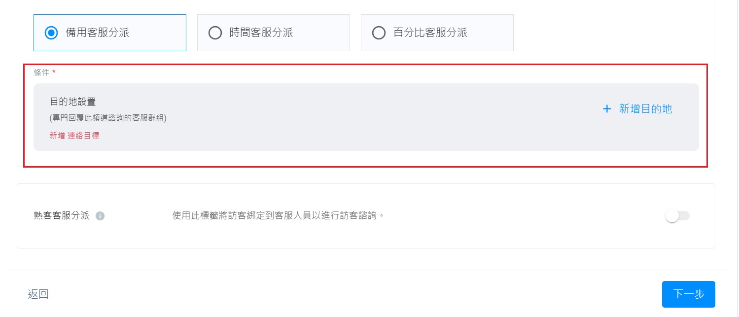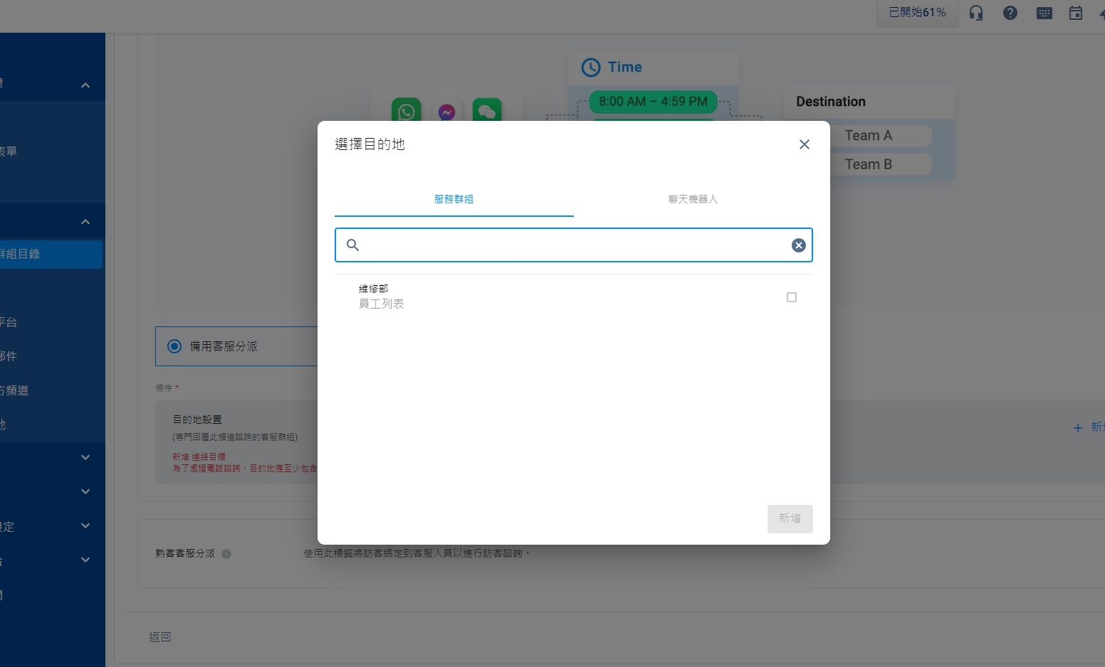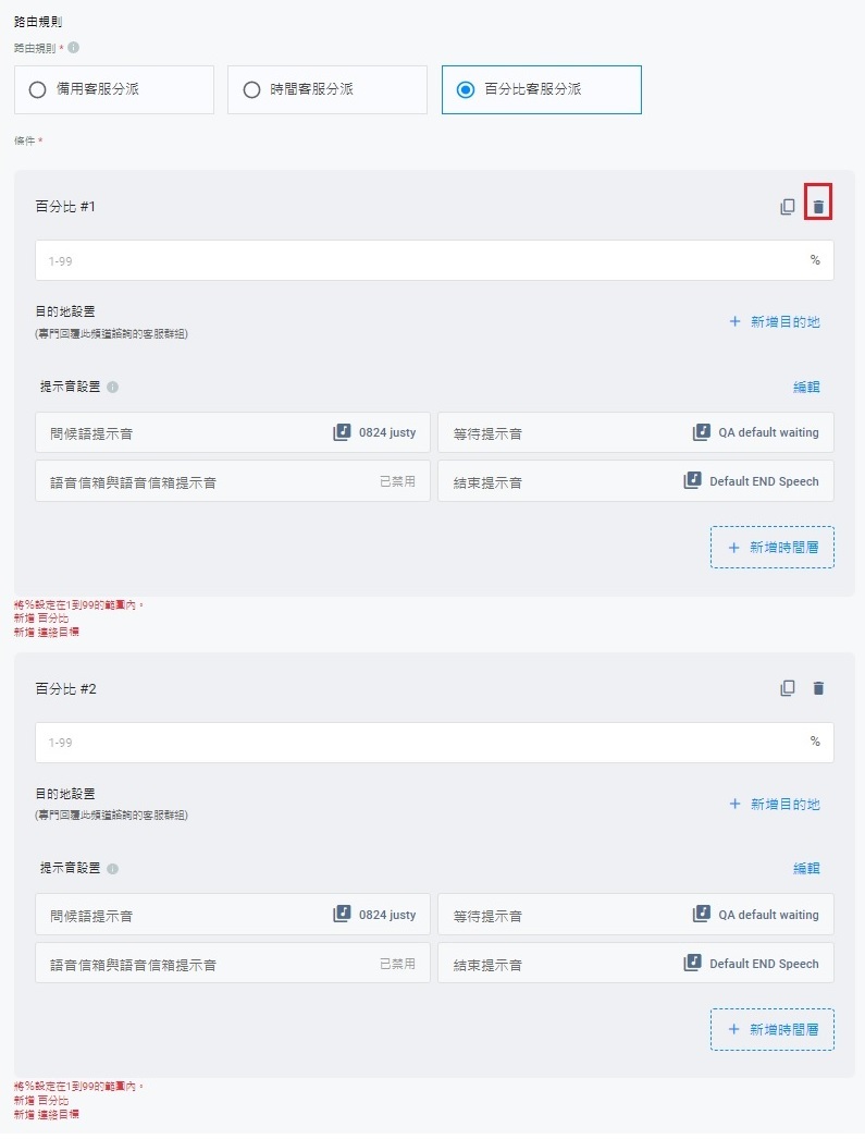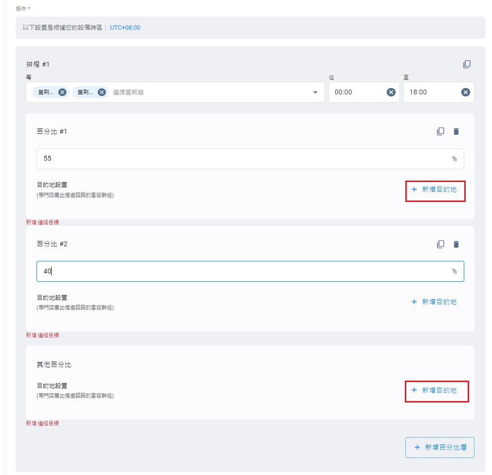 你可以自行在百分比客服分派上新增時間層,從而根據時間分配諮詢。