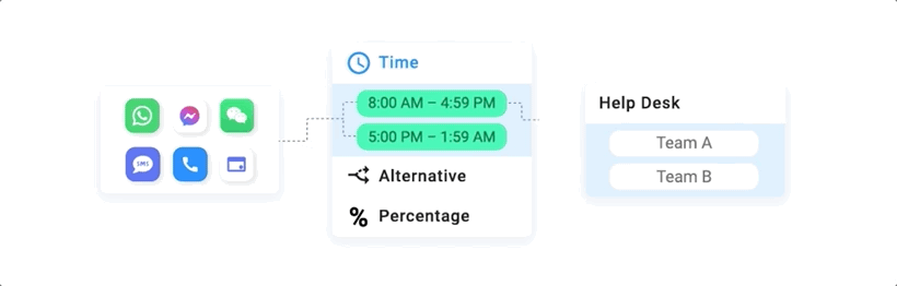 此路由規則根據時間分配諮詢,例如在一天或一周的特定時間,將通話轉到特定的團隊或客服來處理。對員工數目有限,或員工數量經常改變的企業來說,此路由特別有用,因為它有效調配你的資源,從而提高生產力和效率。使用時間客服分派,確保諮詢的高峰時間,能夠有效處理諮詢或通話,同時也避免在較少諮詢的時間,安排過多員工處理諮詢。