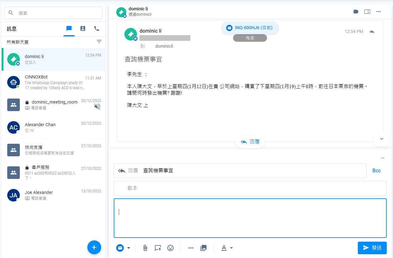 - 當訪客用綁上CINNOX電郵的郵箱,發送電郵予你時,你和訪客便開始用電郵交談。假如你處於上線狀態,被分配到指定客服群組,或是指定員工處理諮詢的目的地,CINNOX控制面板或應用程式,會通知你有關諮詢訊息。這個諮詢亦會在待處理諮詢面板出現。