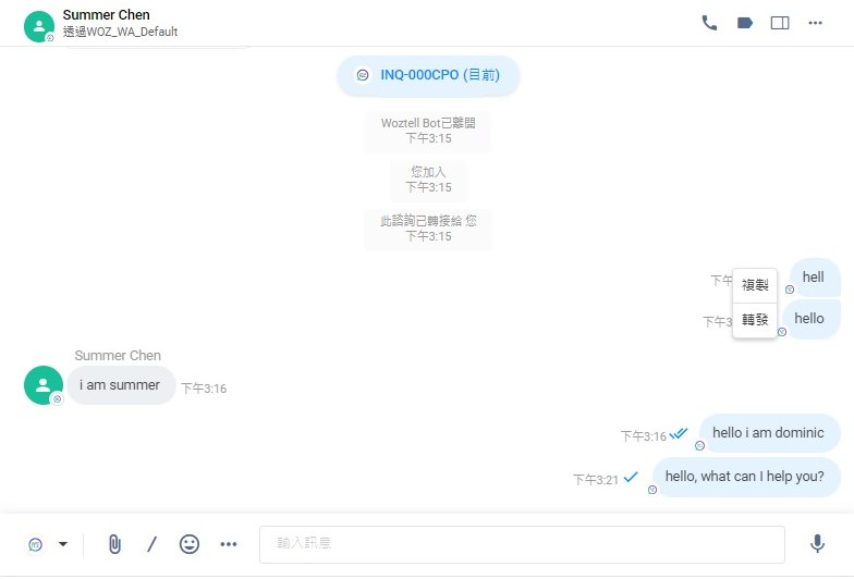 - 當訪客在WOZTELL頻道發送第一個訊息予你時,你和訪客便開始交談。CINNOX之後用自動歡迎訊息回覆。