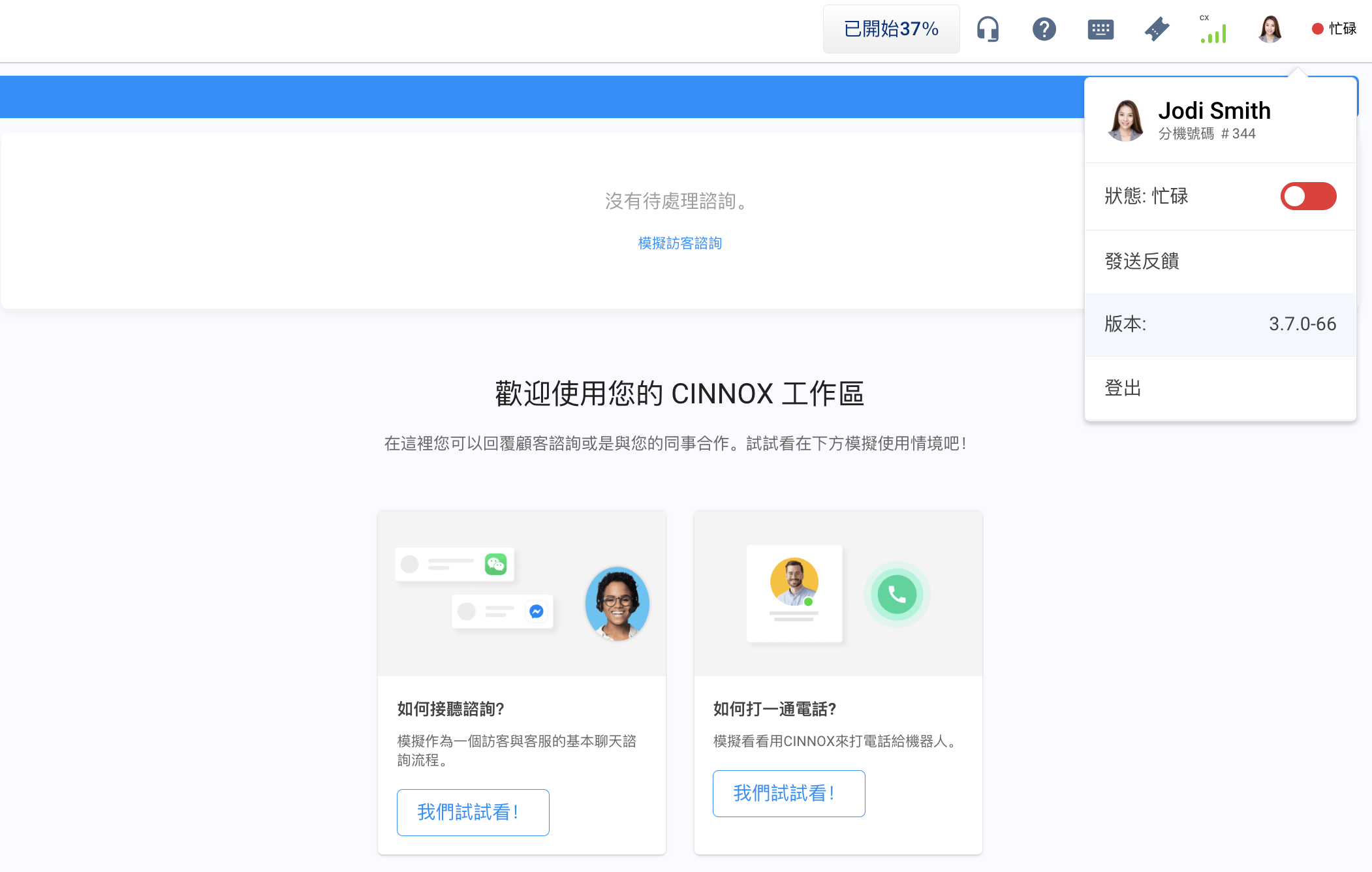 忙碌:員工已登入CINNOX控制面板、應用程式,或同時登入兩者,但自行將狀態改成忙碌,不準備接收新諮詢。