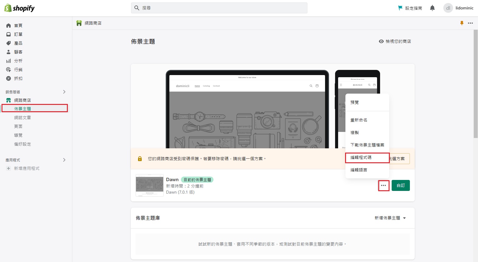 - 在你的Shopify管理介面上,導航到 網上商店>佈景主題。 然後,點擊更多(...),選擇編輯程式碼。