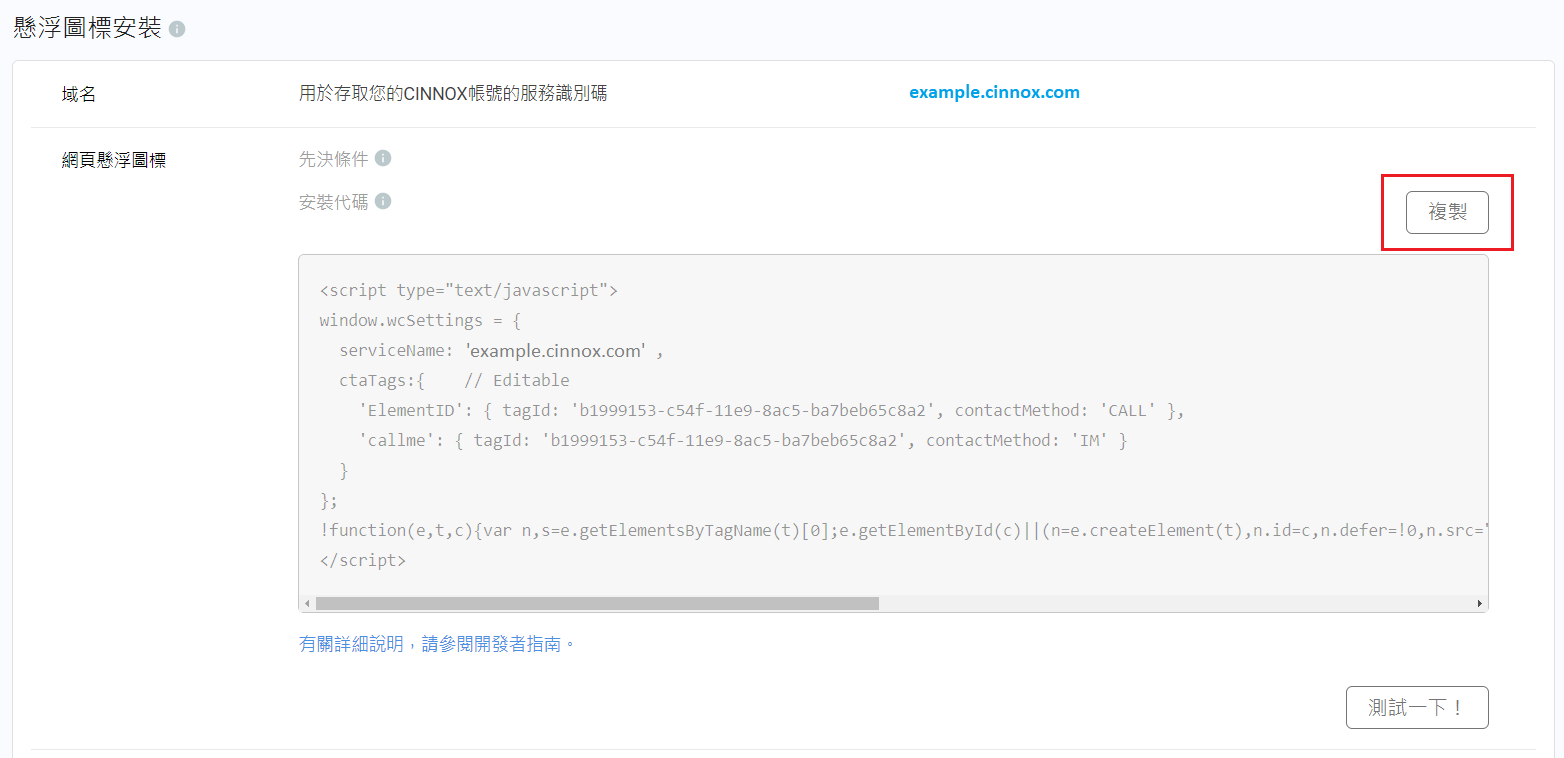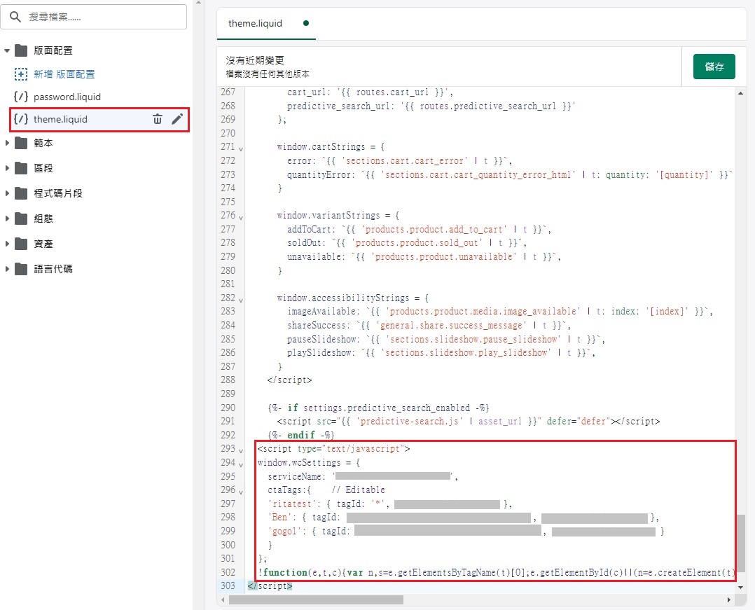 - 將CINNOX懸浮圖標安全代碼貼到標籤中,然後點擊 儲存。
