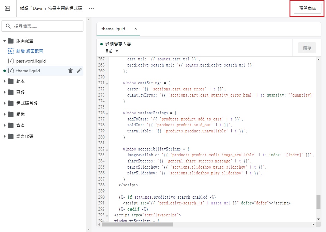 - 返回Shopify管理介面,在此頁中,選擇theme.liquid,從而在每頁安裝CINNOX懸浮圖標。
