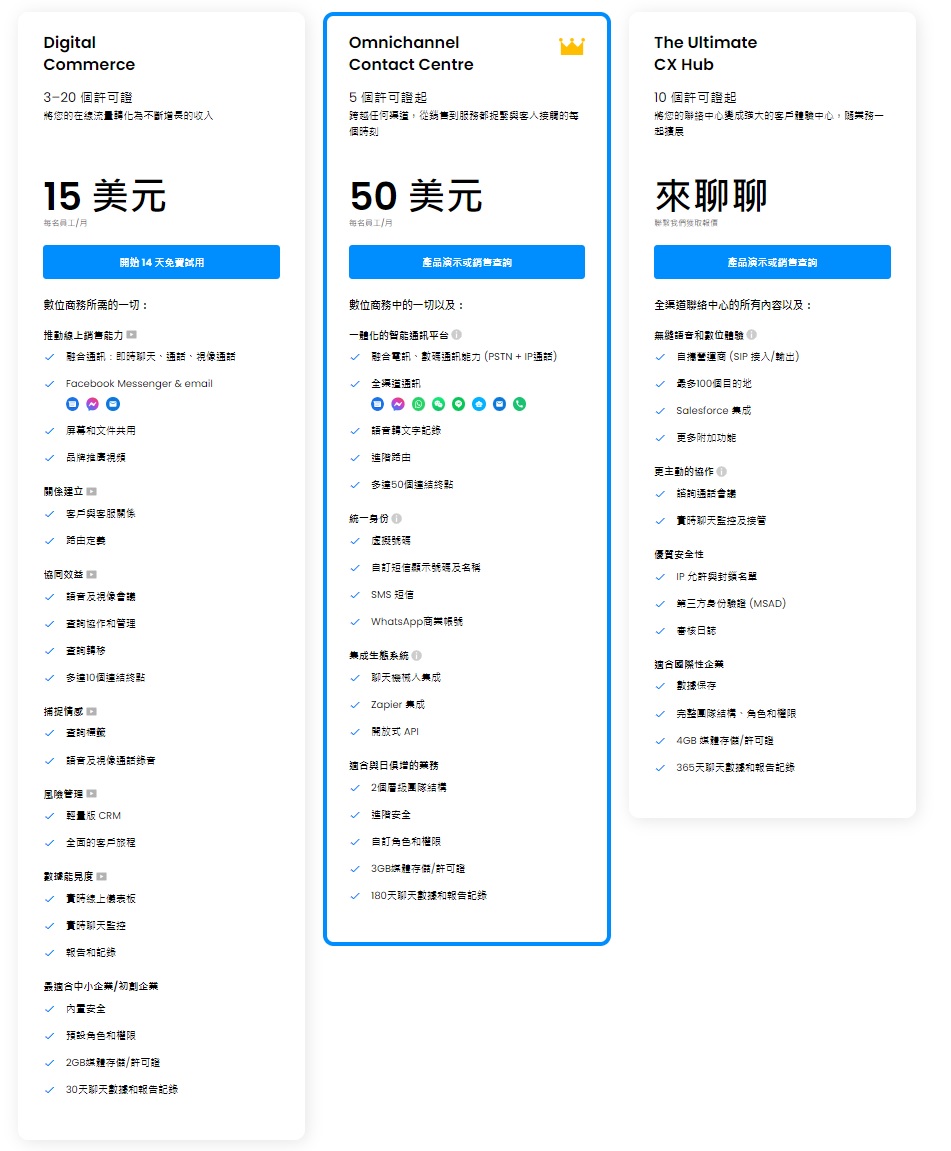 CINNOX提供三種不同的定價計劃,滿足尋找電子商務解決方案、客戶支援聯絡中心,以及高級客戶體驗工具的企業之不同需要。