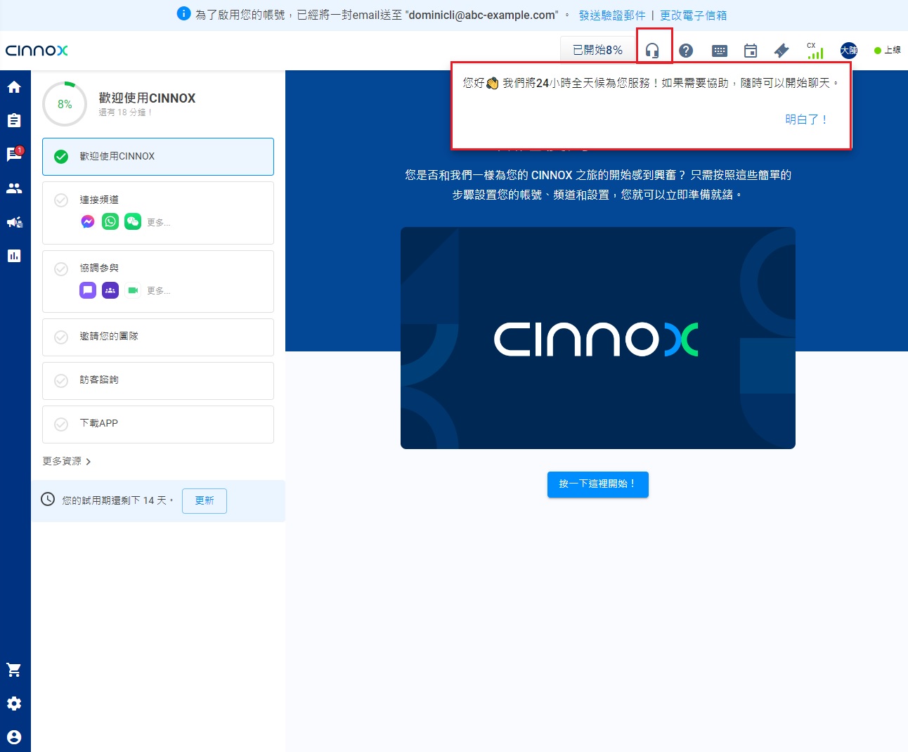 歡迎來到CINNOX控制面板! 透過入門步驟和影片,開始探索CINNOX吧!