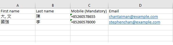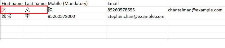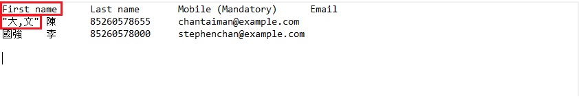 First name欄裡的大,文含有逗號。於是,文字分隔成兩行,大在First name欄,而文則在Last name欄。