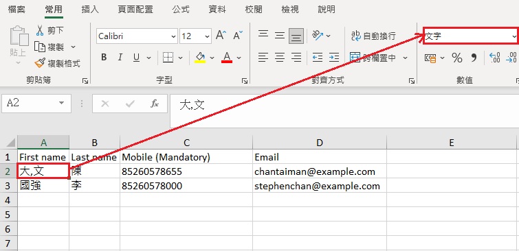 在含有逗號的文字加上開雙引號(“”),例如:"大,文" ,並將其檔案儲存為CSV檔案上載。