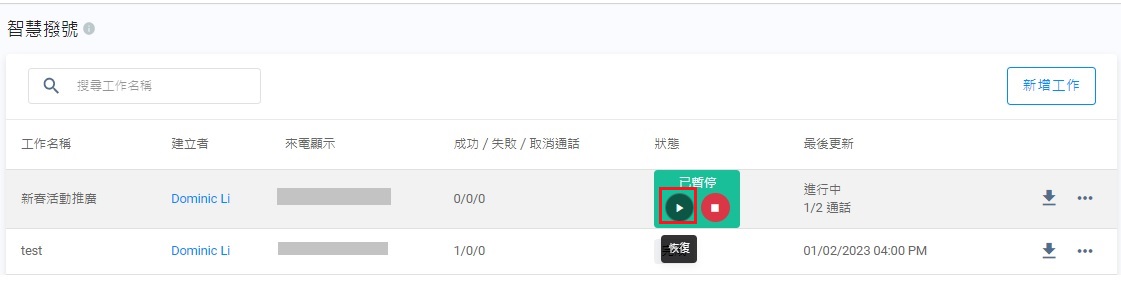 - 在智慧撥號頁面,找出你想重新進行而暫停了的工作。點擊狀態旁的恢復按鈕( )。彈出式訊息會顯示你是否確認重新進行工作。
