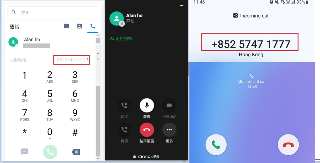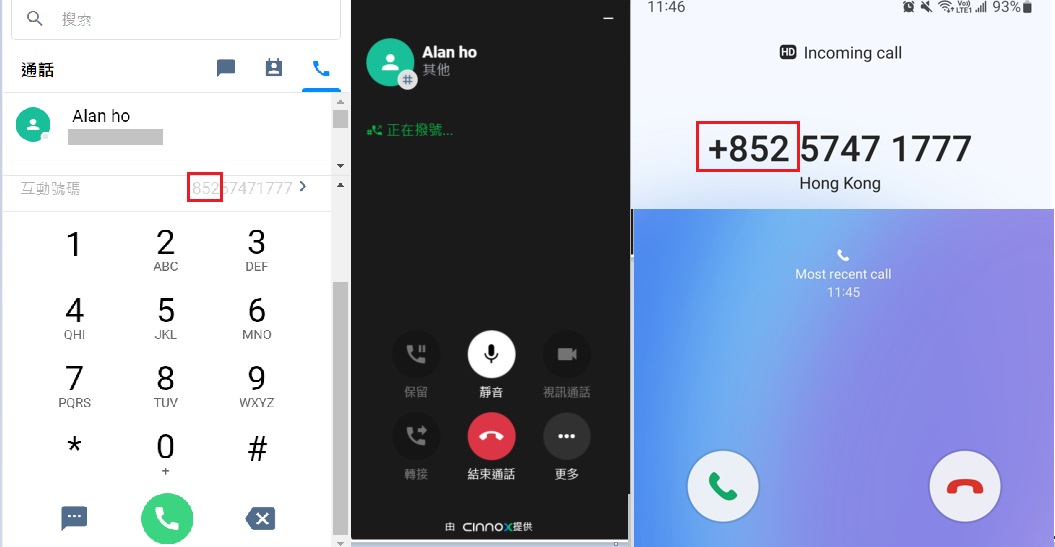使用CINNOX國際直撥(IDD),致電到同一地區和國家,有可能顯示國家代碼。這視乎不同國家電訊商的規例而定。