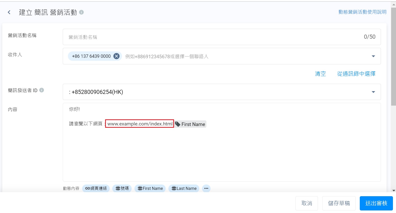 一些地區如中國內地(+86)和台灣(+886),不准發送附有網頁連結的簡訊內容。雖然你仍可發送此類簡訊內容,但對方不能接收。
