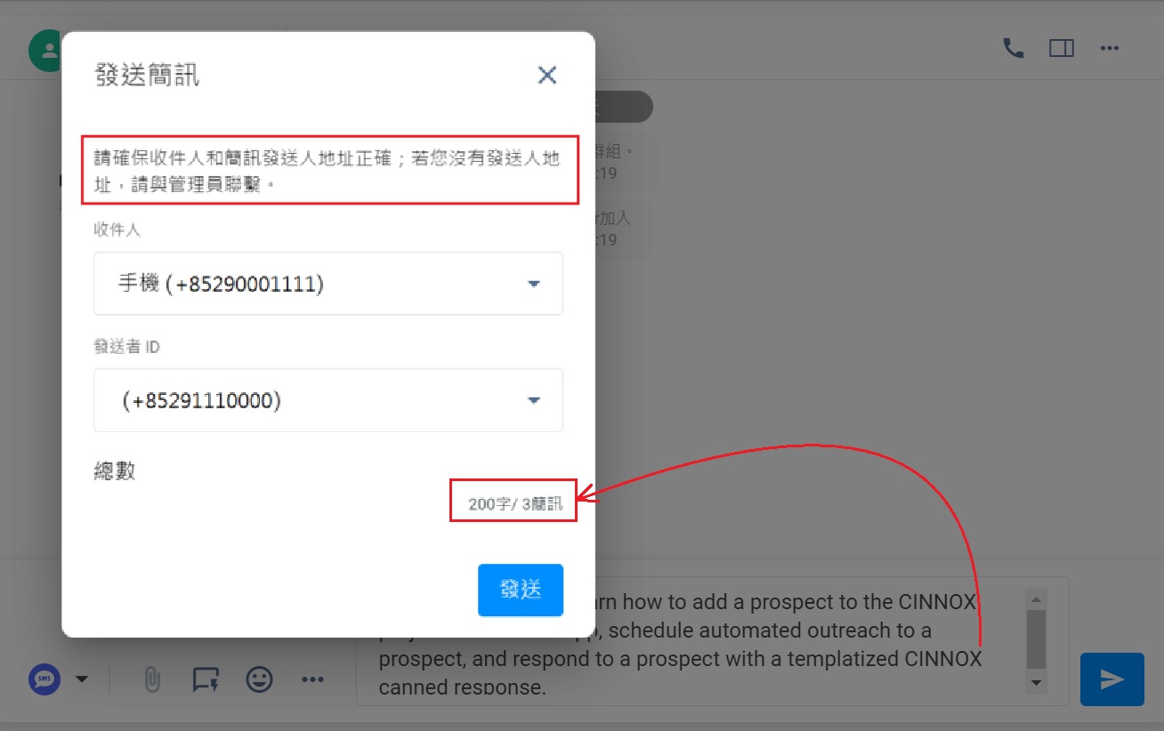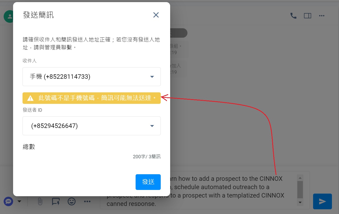 請確保簡訊收件人使用的號碼為手提電話號碼,因為非手提電話號碼不能接收簡訊。假如收件人使用非手提電話號碼,對話視窗會顯示警告字句。