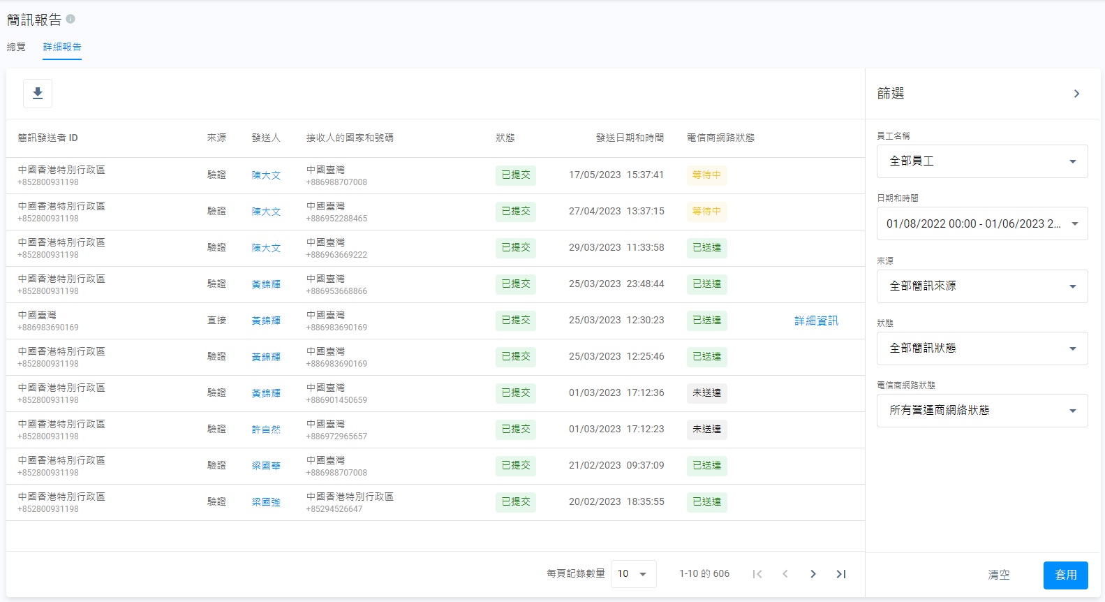 在以下截圖,SMS 傳遞分析顯示員工在指定時間和狀態內,發送的簡訊總數。