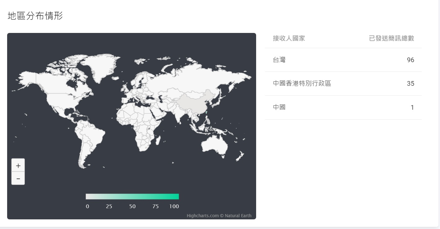 地區分布情形顯示在指定時間內,簡訊收件人的所屬位置,以及發送到其所屬位置的簡訊總數。