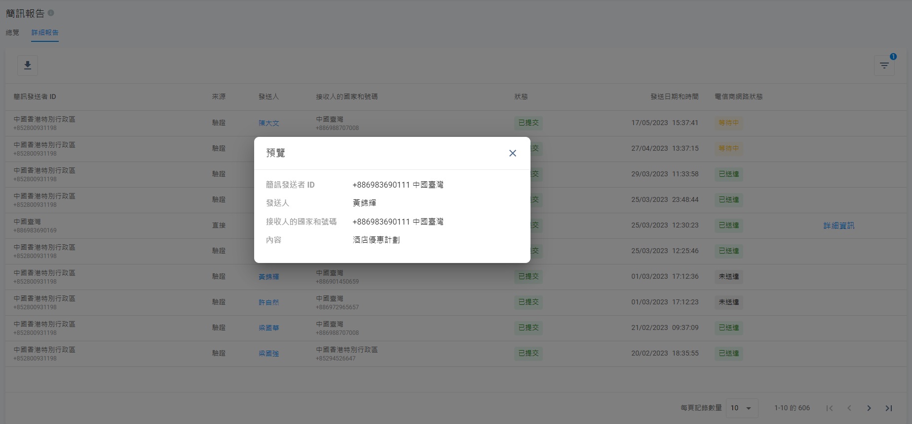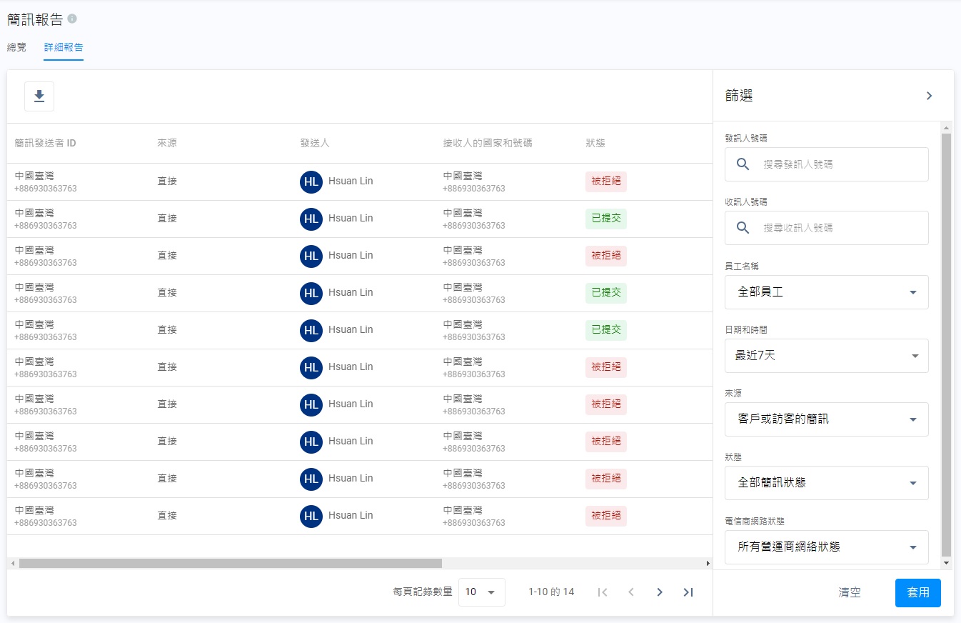 | 來源 | 顯示簡訊是否用作直接聯絡、會議邀請的簡訊,或是Open API驗證的簡訊。 |