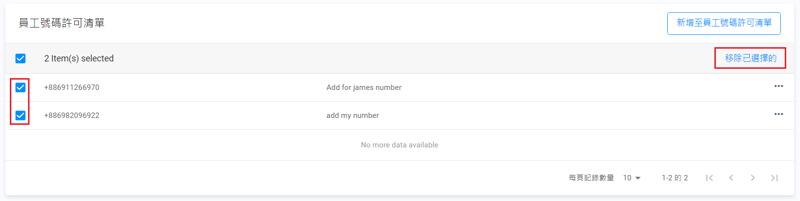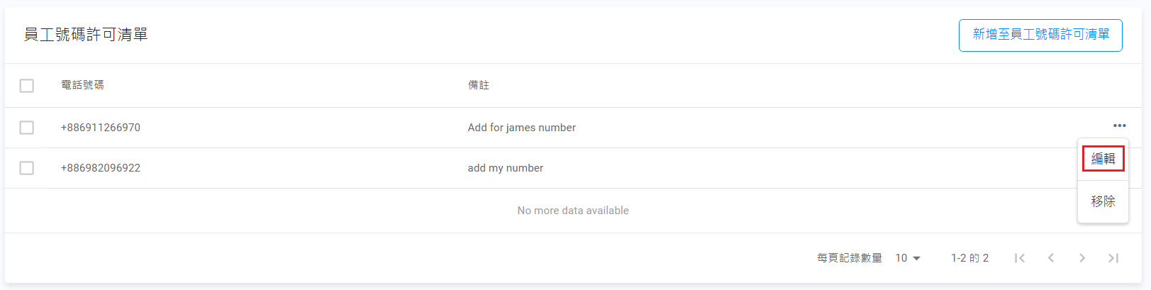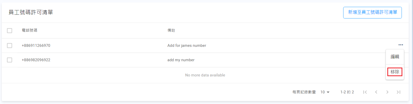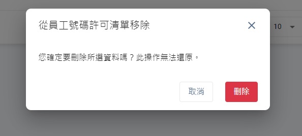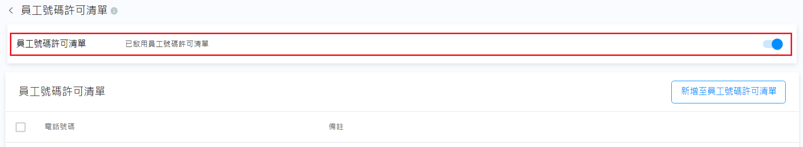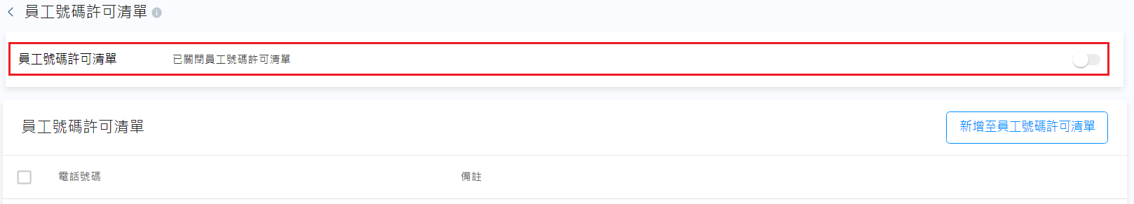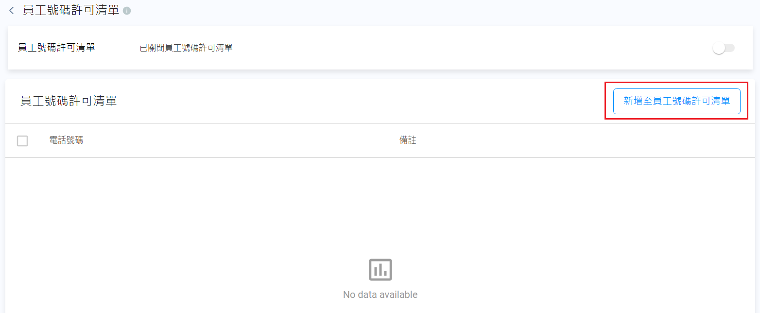 - 在員工號碼許可清單頁,點擊新增至員工號碼許可清單按鈕。