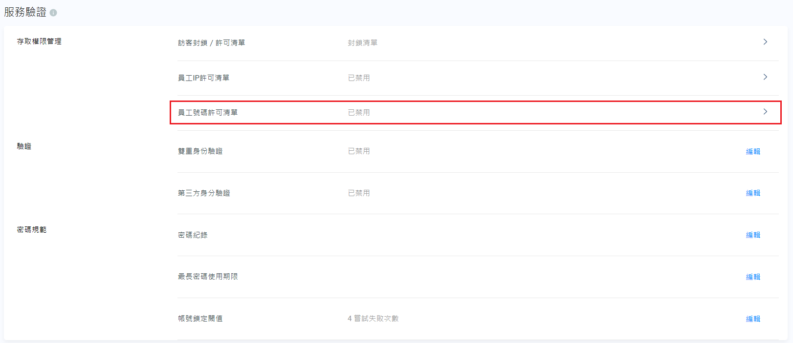 - 在員工號碼許可清單頁中,向下滾動,找出你要編輯的條目,然後點擊條目右側的編輯。