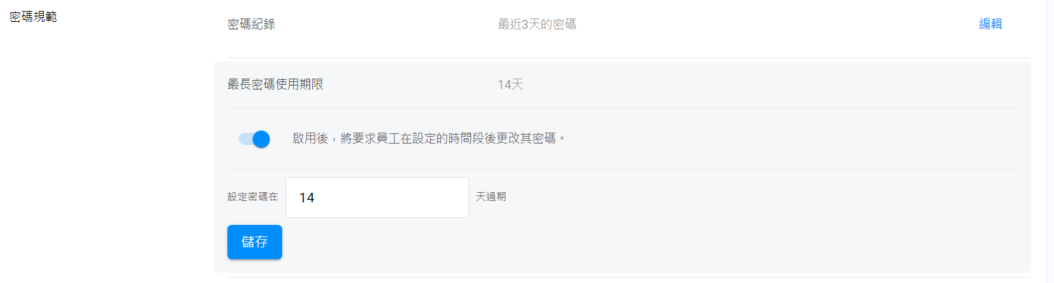 - 最長密碼使用期限: 將密碼設定為在指定日子後失效,使員工更改密碼。