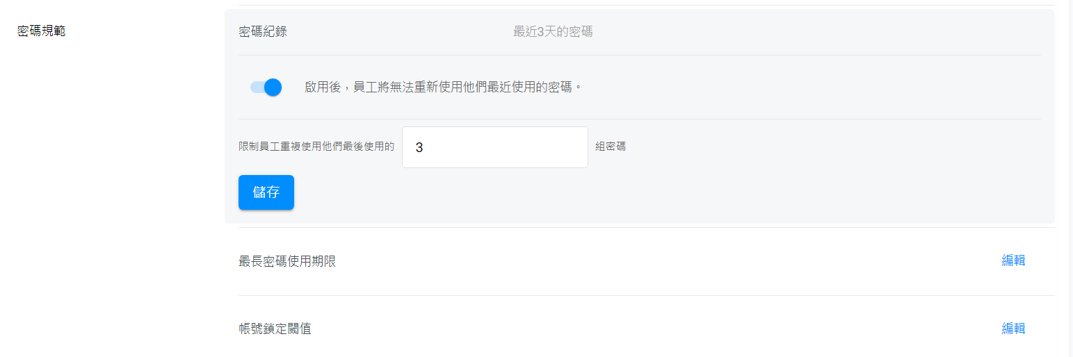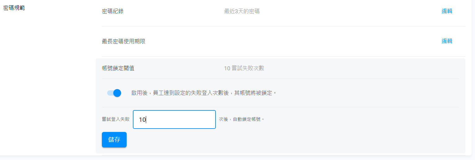 - 帳號鎖定閾值: 在指定登錄失敗的次數後,封鎖員工帳號。