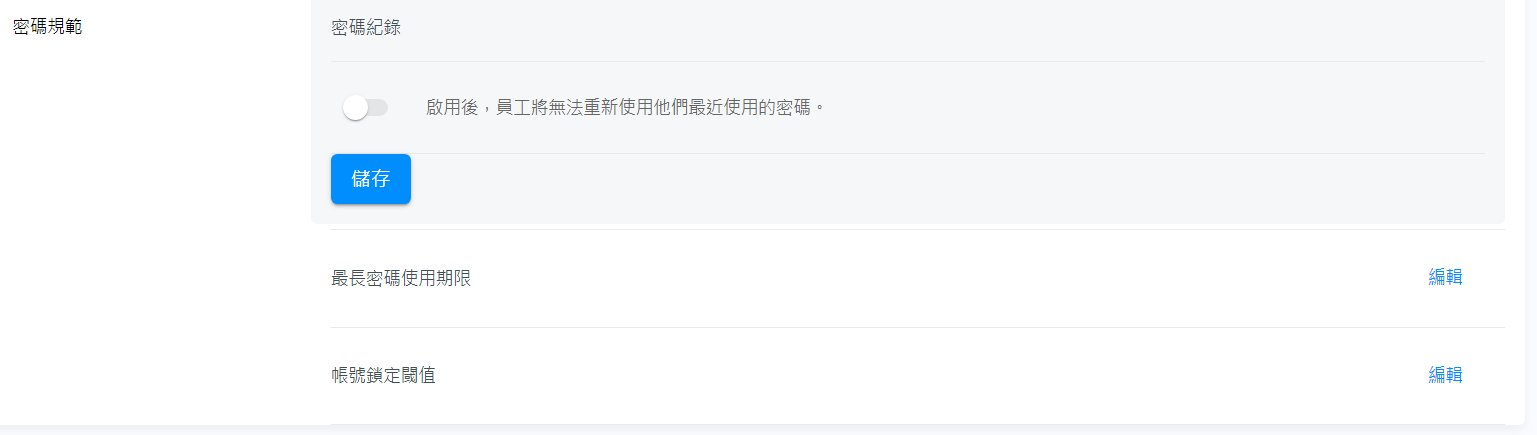 - 密碼紀錄: 防止員工重複使用他們最近使用的的密碼。